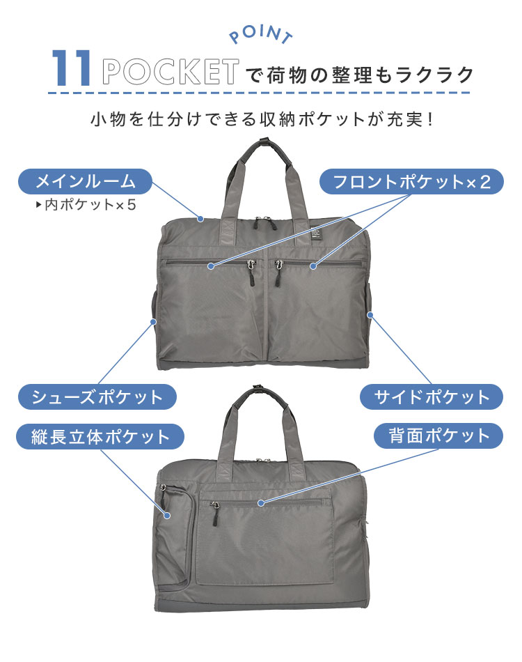 37L大容量の多機能ボストン、CARRY(キャリー)シリーズ。使いやすく便利な機能をたくさん詰め込み、ボストンバッグとしての完成度を極めました。旅行や出張はもちろん、荷物の多い方の普段使い、スポーツジム用など、あらゆるシーンで大活躍!背面にボトルや折り畳み傘を入れられる、縦長立体ポケット付き。欲しい時にさっと出し入れ可能!側面のシューズポケットはメイン収納と分かれているので衛生的です。両面撥水加工なので雨の日のお出かけも安心◎