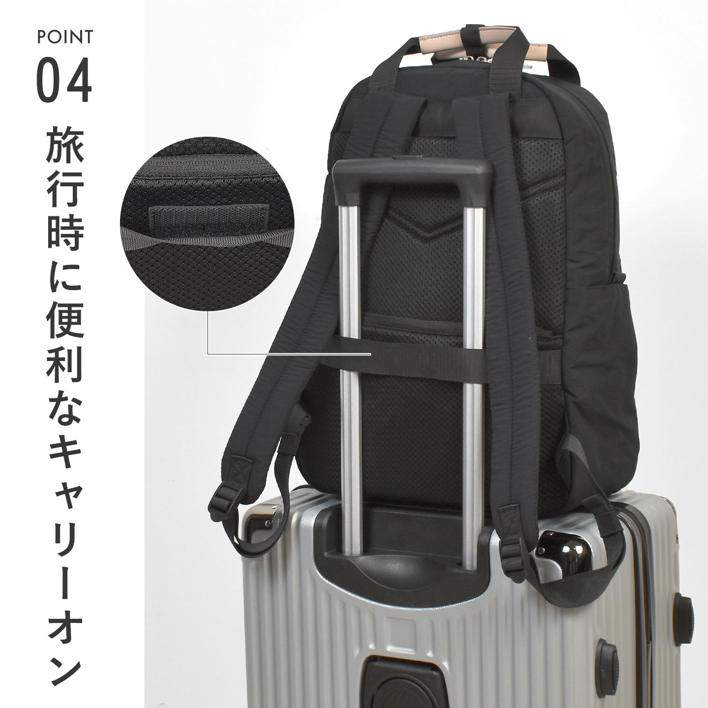軽くてやわらかなナイロン生地とナチュラルカラーの合皮を使用した、おしゃれで落ち着いたデザイン。両面はっ水仕様で雨の日も安心。ハンドル付きで使いやすく、PCや小物、ボトル、折りたたみ傘などを整理しやすいポケットが充実。キャリーオンテープと背面セキュリティポケットも備え、普段使いや旅行シーンにぴったりのリュックです。