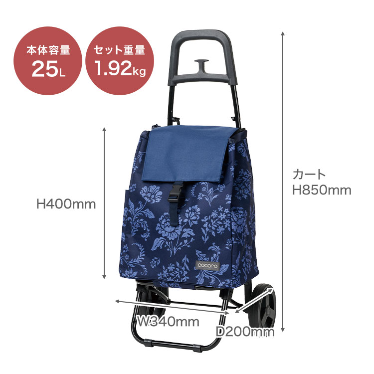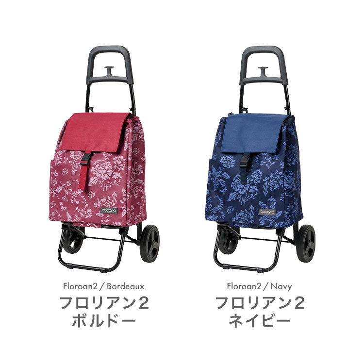 どれだけ買い物しても、身軽さはかわらない便利で使いやすいショッピングカート。毎日のお買い物にぴったりの小回りの利くジャストサイズで、エレガントな柄と華やかなカラーです。