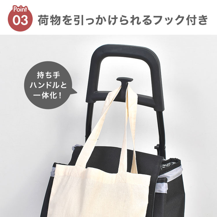 買い物袋やバッグを掛けられる便利なフック付き。持ち手ハンドルと一体化しているので安定して荷物を掛けられます。