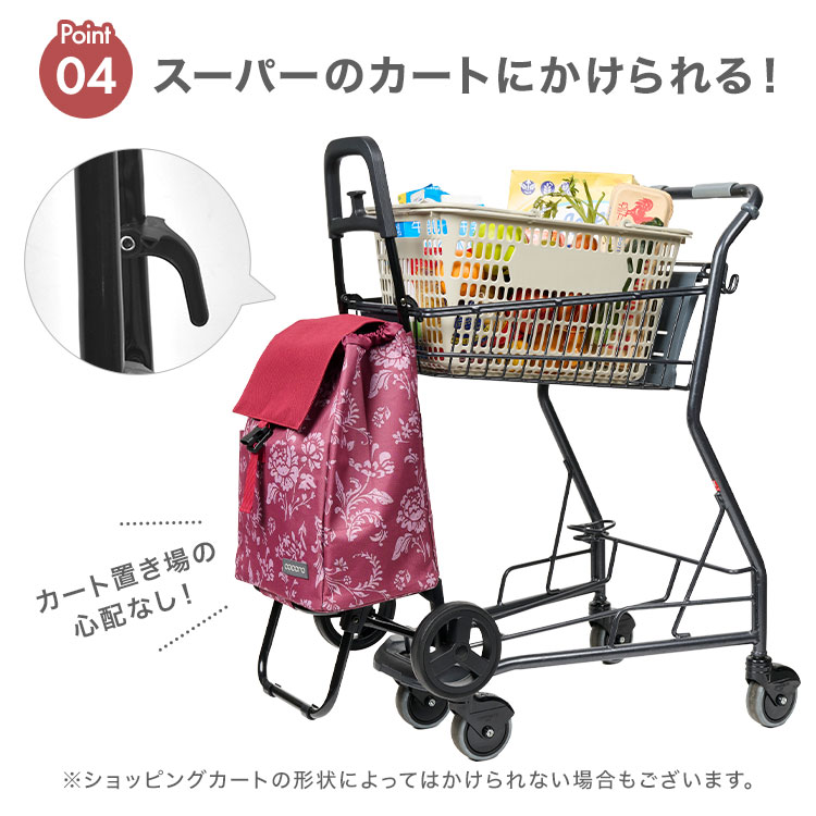 背面についているフックを使えばお店のショッピングカートにかけることができます。お買い物中のカートの置場を心配する必要がありません。