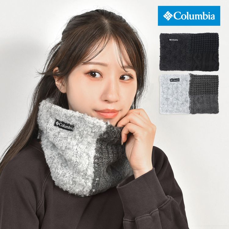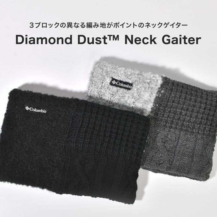 Columbia(コロンビア)のネックウォーマー「ダイアモンドダストネックゲイター」。表地は異なる素材と編地を組み合わせた3ブロックデザイン、裏地には軽量で保温性に優れたフリース素材を使用。アウトドアやスキー、通勤通学など冬の防寒に最適です。ユニセックスで使えるシンプルなデザイン。