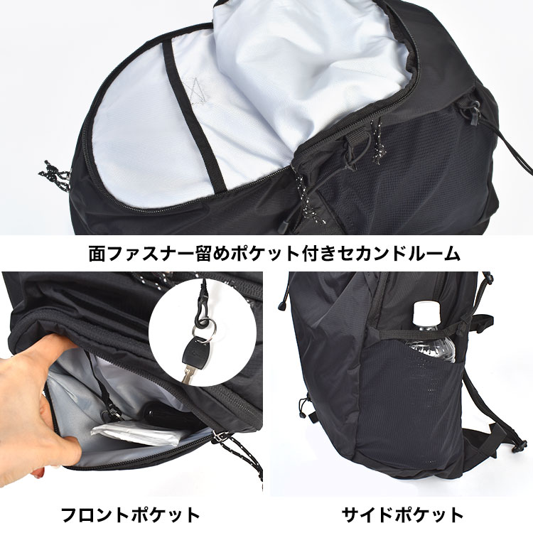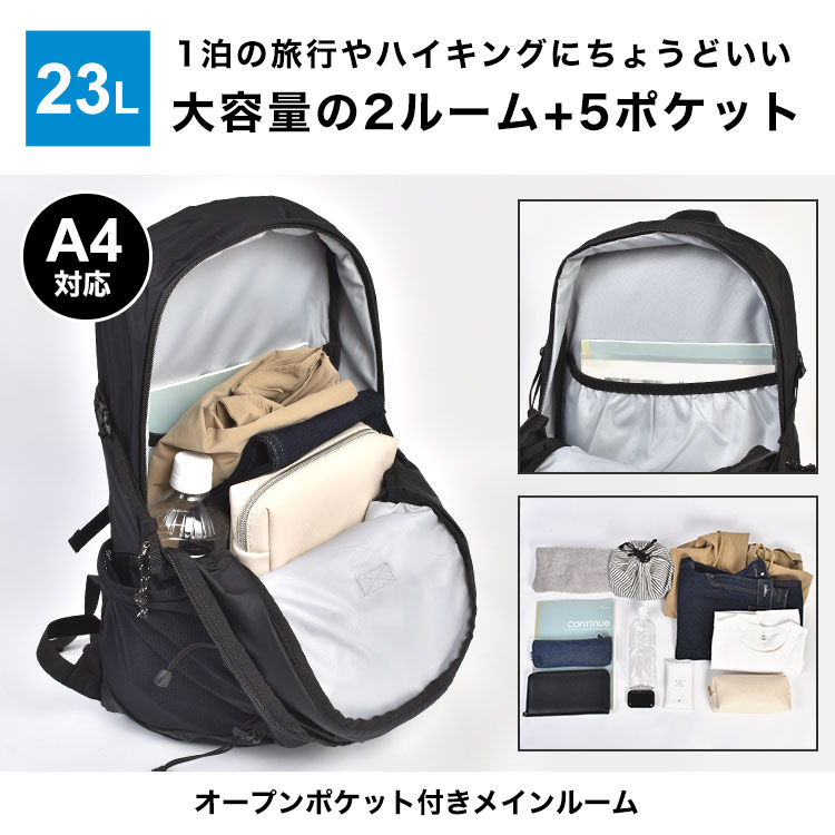 無駄のないシンプル設計ながら、多ポケットでA4サイズが入る実用性も兼備。日帰り登山や一泊二日のレジャーにもぴったりの容量です。