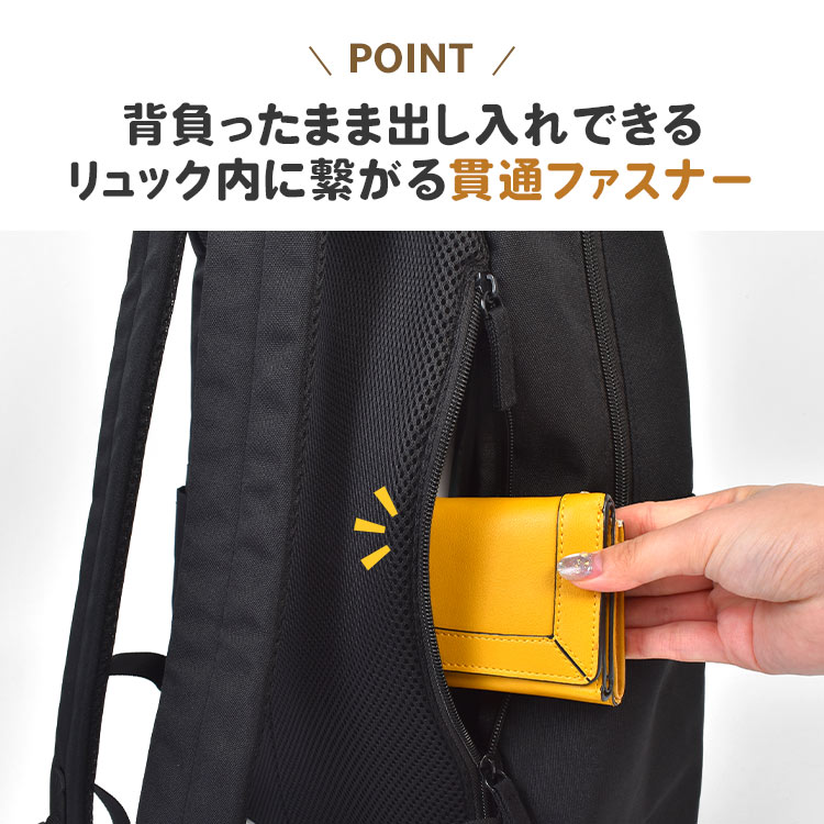 リュックを背負ったまま荷物の出し入れができる、内側につながる貫通ファスナー付きなのも便利なポイント。