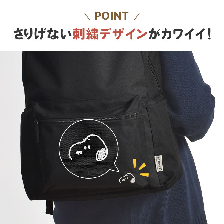 スヌーピーの刺繍がさりげなく可愛い、デイリー使いにぴったりなリュック。小学校高学年から大人まで使いやすいサイズ感で、通学・通勤はもちろん、遠足やアウトドアなど幅広いシーンで活躍します。