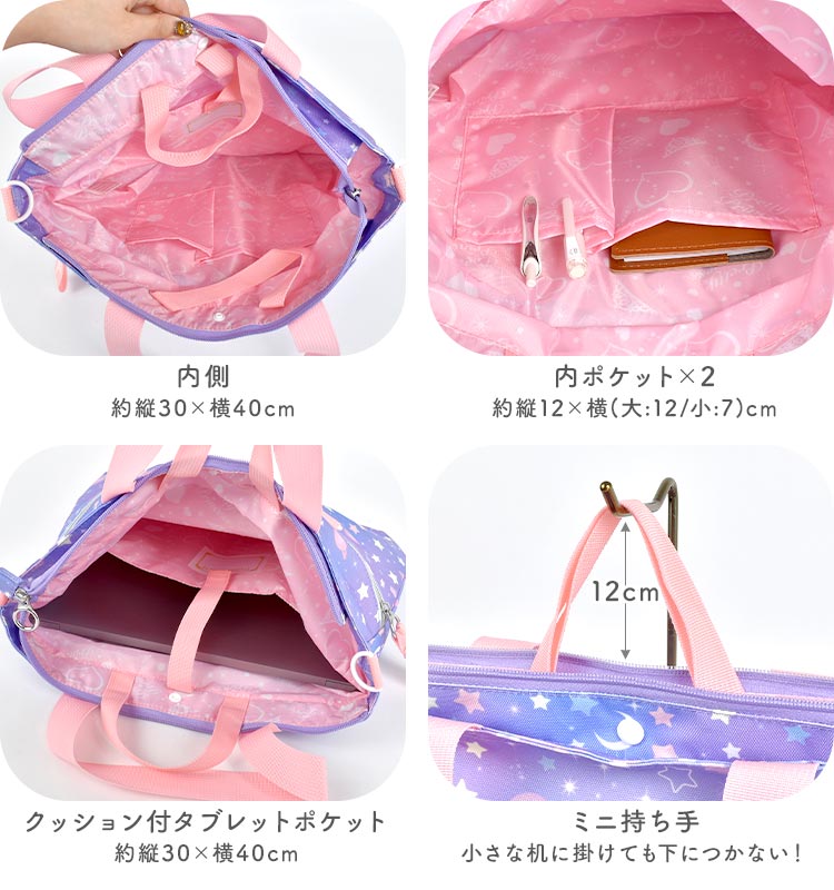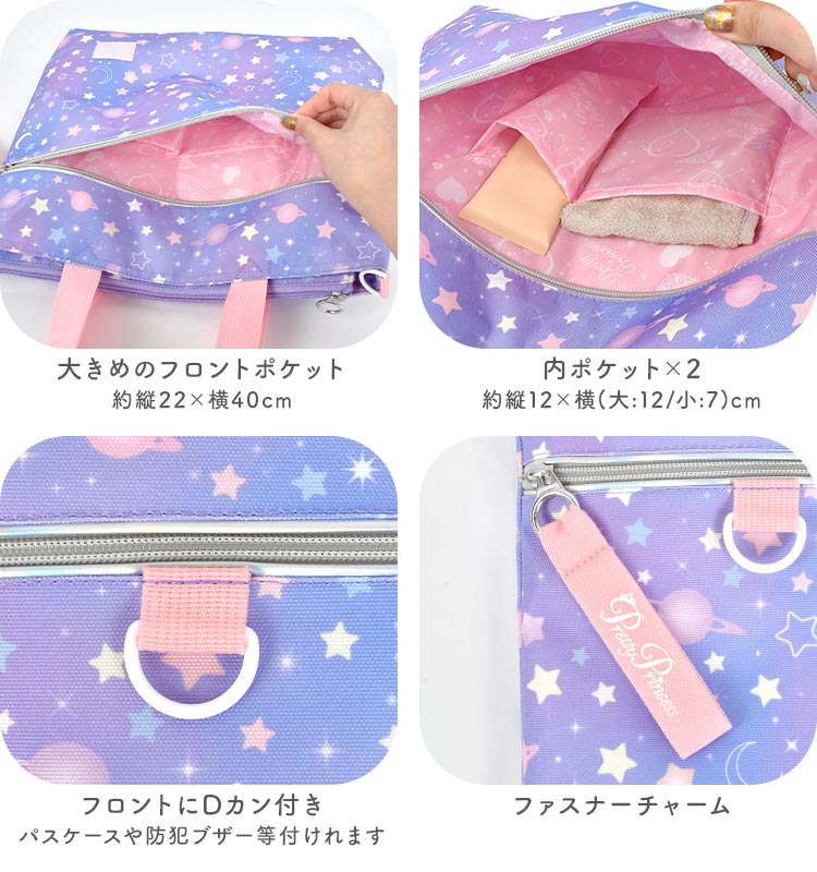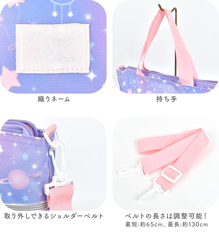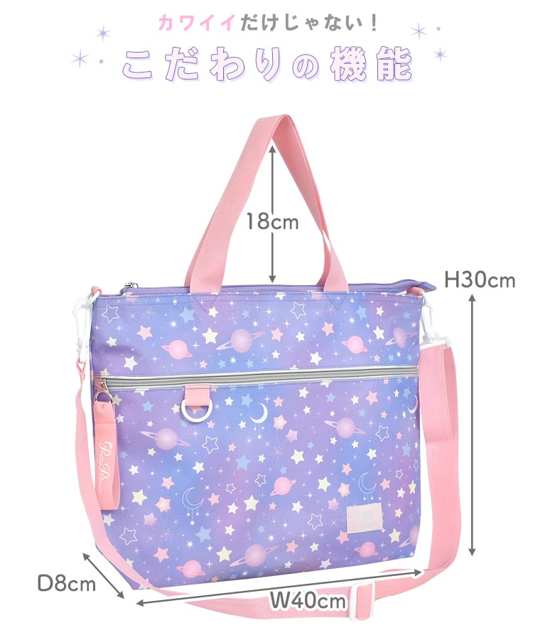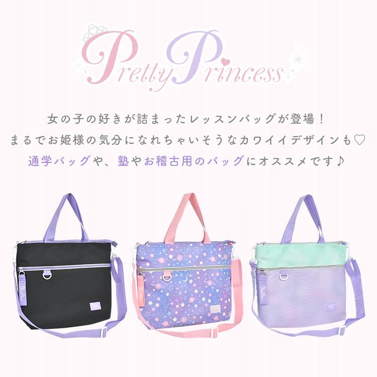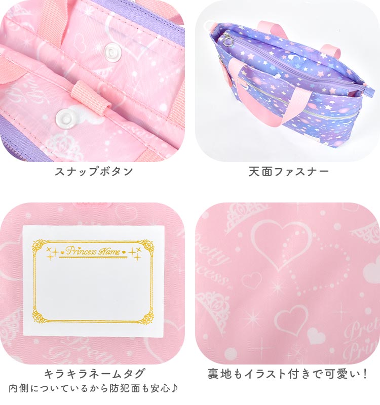 女の子の好きが詰まったレッスンバッグが登場!まるでお姫様の気分になれちゃいそうなカワイイデザインも?取り外しできるショルダーベルト付きなのでショルダーバッグとしても使える2way仕様!机に掛けても下にバッグがつかないようにしてくれるミニ持ち手や、タブレットを収納できるタブレットポケットなど嬉しい機能が詰まったレッスンバッグになっています!通学・通園バッグや、塾やお稽古用のバッグにオススメ♪