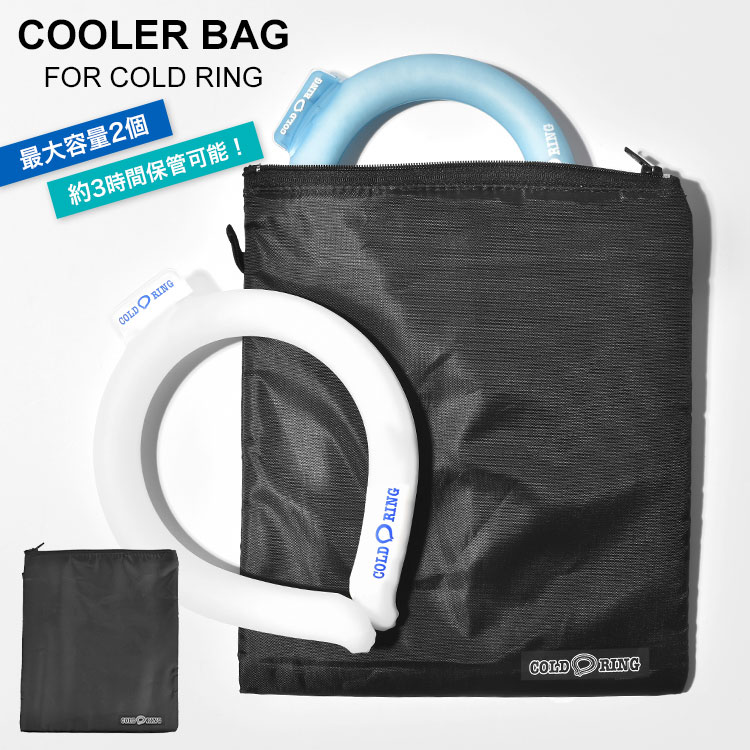 コールドリング専用保冷バッグが登場。保管時間は凍らせたコールドリングで約3時間、保冷剤と一緒に収納する約5~6時間も冷感を保ってくれます。リングがぬるくなってしまった場合も交換用にもう一つ保管保管しておくのもオススメです。