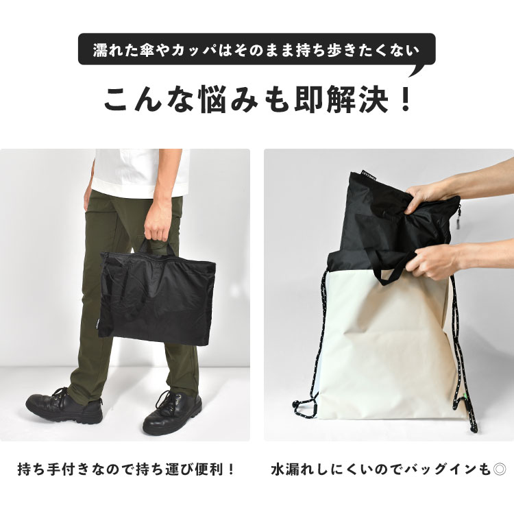 デザインはシンプルでありながらも機能性を重視しており、日常生活のさまざまなシーンで活躍します。アウトドア活動やスポーツ後の濡れた衣類の持ち帰り、急な雨による濡れた傘の収納など、幅広い用途での使用が想定されています。