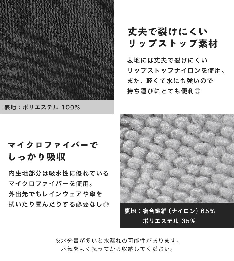 このレインウェア吸水収納ケースは、内部にマイクロファイバー素材を採用しており、水分をしっかりと吸収します。持ち手が付いているため、持ち運びも簡単で、レインウェアや折り畳み傘の収納に最適です。また、ペットボトルや水着、トレーニングウェアなど、様々な用途に対応可能な多機能性を備えています。