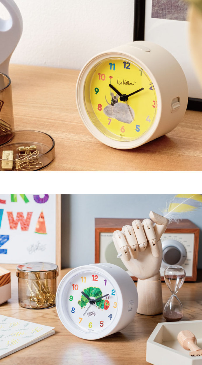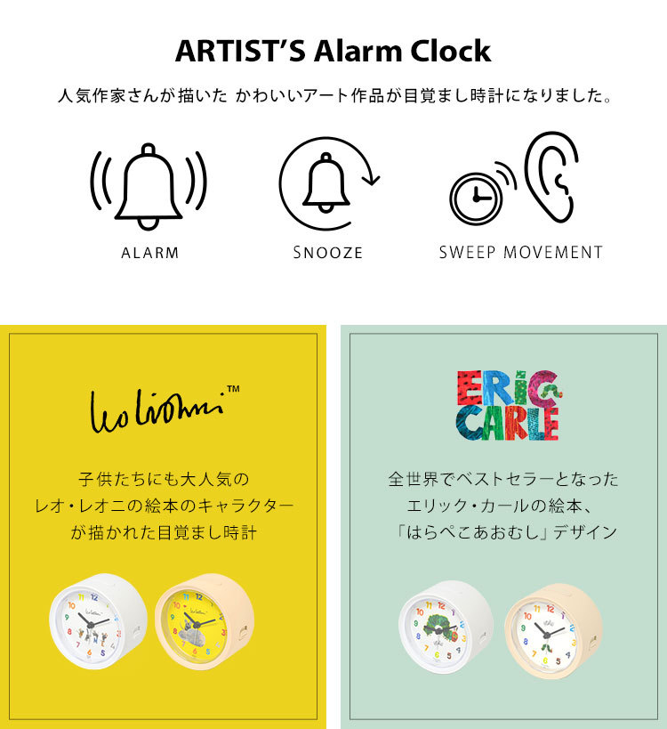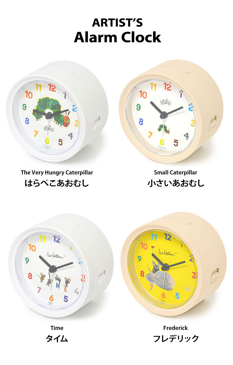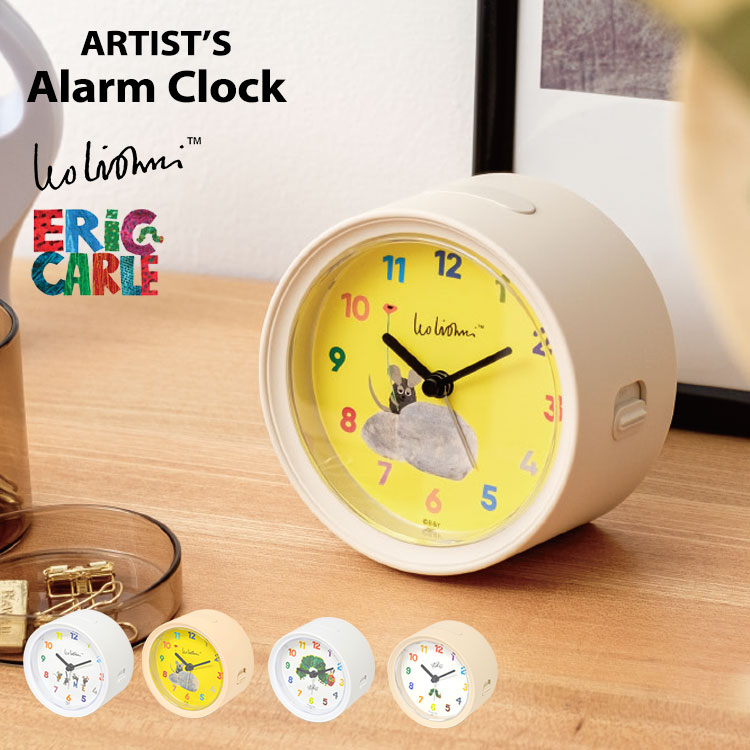 【レオ・レオニ】【エリック・カール】人気作家さんが描いたかわいいアート作品が目覚まし時計になりました。◇スイーブムーブメント(コチコチ音がしない)◇アラーム(3段階に音が変化)◇スヌーズ機能(5分間隔)◇電池式(単3乾電池1本/別売り)◇1年間補償付き