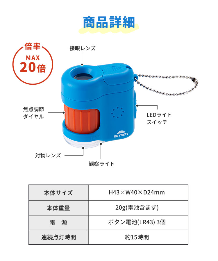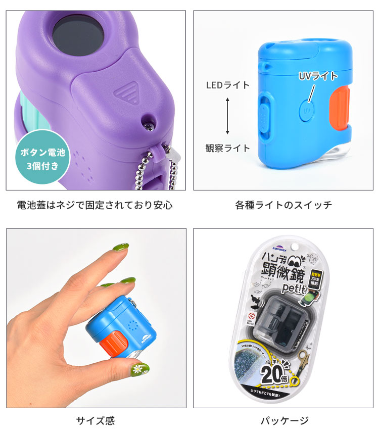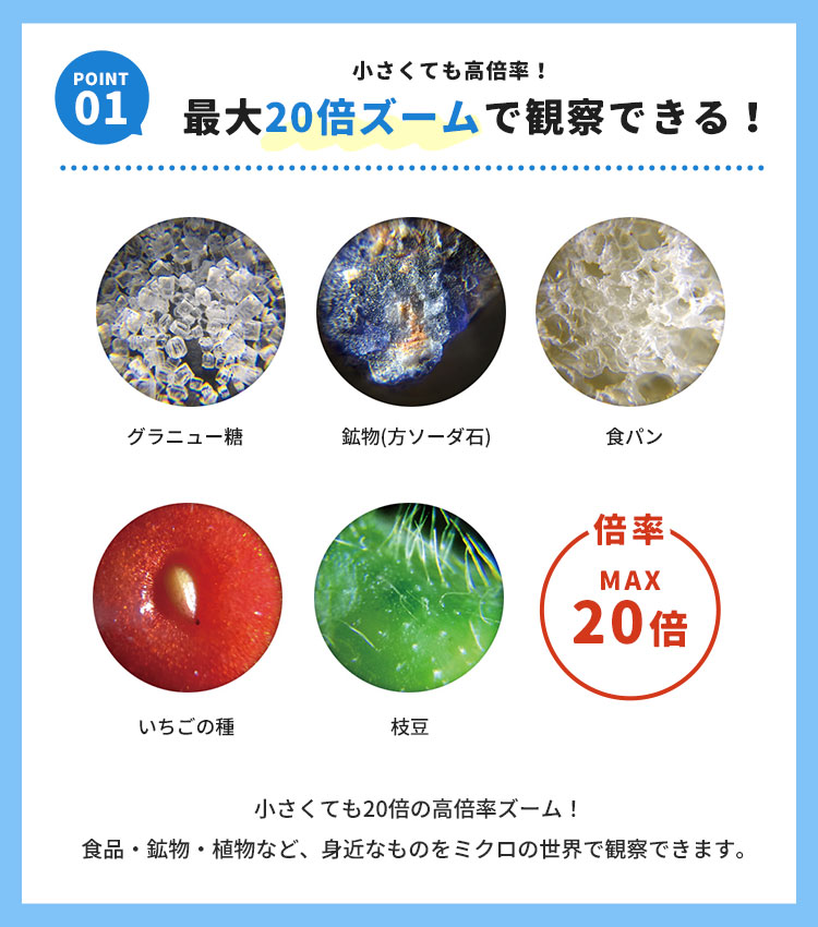 ミクロの世界には驚きがいっぱい!持ち運びやすいミニサイズと直感的な操作で,簡単に本格的な観察ができるミニ顕微鏡です。サイズは小さくても20倍の高倍率!接眼レンズにスマートフォンのカメラレンズを合わせることで簡単に顕微鏡写真を撮影することもできます。観察物や手元を照らすLEDライトと身近な光るものを観察できるUV(紫外線)ライトも付いており、さまざまな実験・観察の手助けに。お子様の自由研究や外遊びの他、鉱物の撮影などにも便利です。