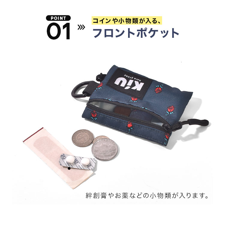 フロントポケットには、コインや絆創膏、お薬などの小物類をすっきり収納できます。