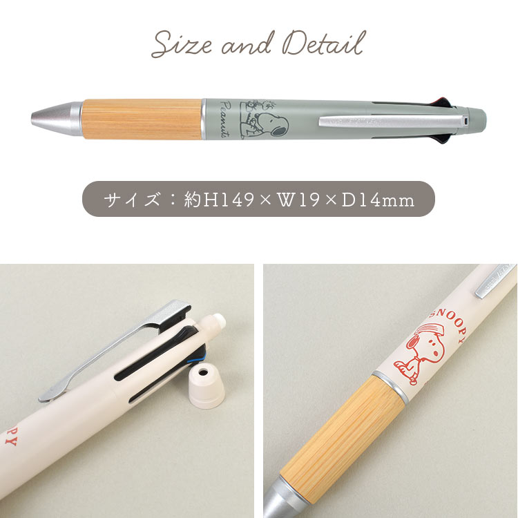 ボールペン4色(黒・赤・青・緑)とシャープの機能が揃った多機能ペン。なめらかな書き味で大人気の『ジェットストリーム』に、美しく耐久性を兼ね備えた天然竹製グリップ『BAMBOO(バンブー)』シリーズが新登場!シンプルなスヌーピー柄と落ち着いたくすみカラーで、ナチュラルな雰囲気が魅力のデザインです。学生さんはもちろん、職場用ステーショナリーにもぴったり。プレゼントやギフトにも◎