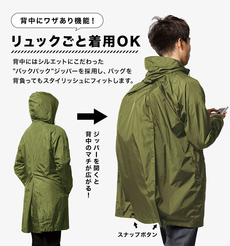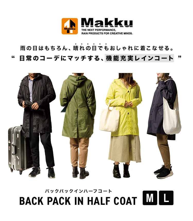 雨の日はもちろん、晴れの日でもおしゃれに着こなせる♪日常のコーデにマッチするMakkuの機能充実レインコート。スタイリッシュな見た目で男女問わずに使いやすいデザインです。背中には"バックパック"ジッパーを採用し、リュックごと着用できるので、雨の日の通勤通学にもぴったりです。