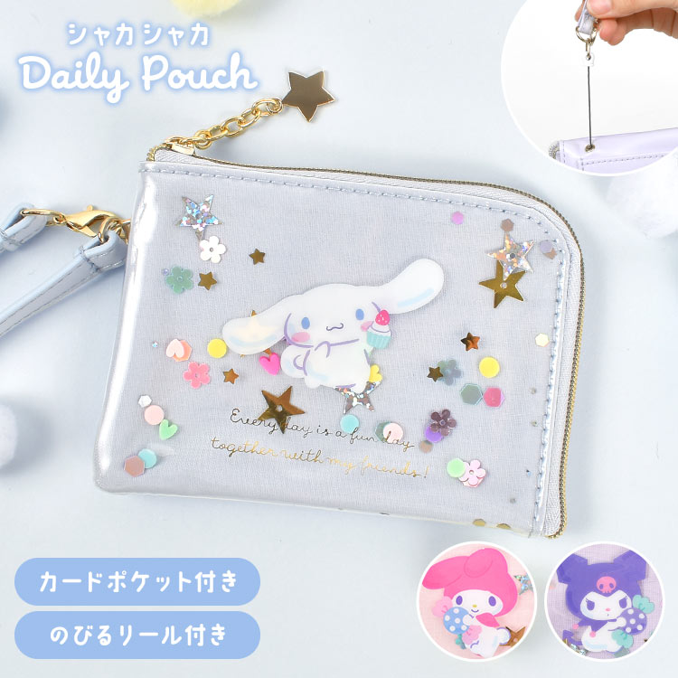 サンリオキャラクターのデイリポーチが登場!スパンコールがシャカシャカ動いてとってもキュート♪ファスナータイプのポーチは、鍵や小銭などの小物入れにぴったり。裏面はカードポケットになっています。スライド窓付きなので、カードの出し入れも楽々♪さらに伸びるリール付きで、改札でのタッチもスムーズ◎ストラップでカバンやリュックに簡単に取り付けることができます。ギフトやプレゼントにもオススメのアイテムです。