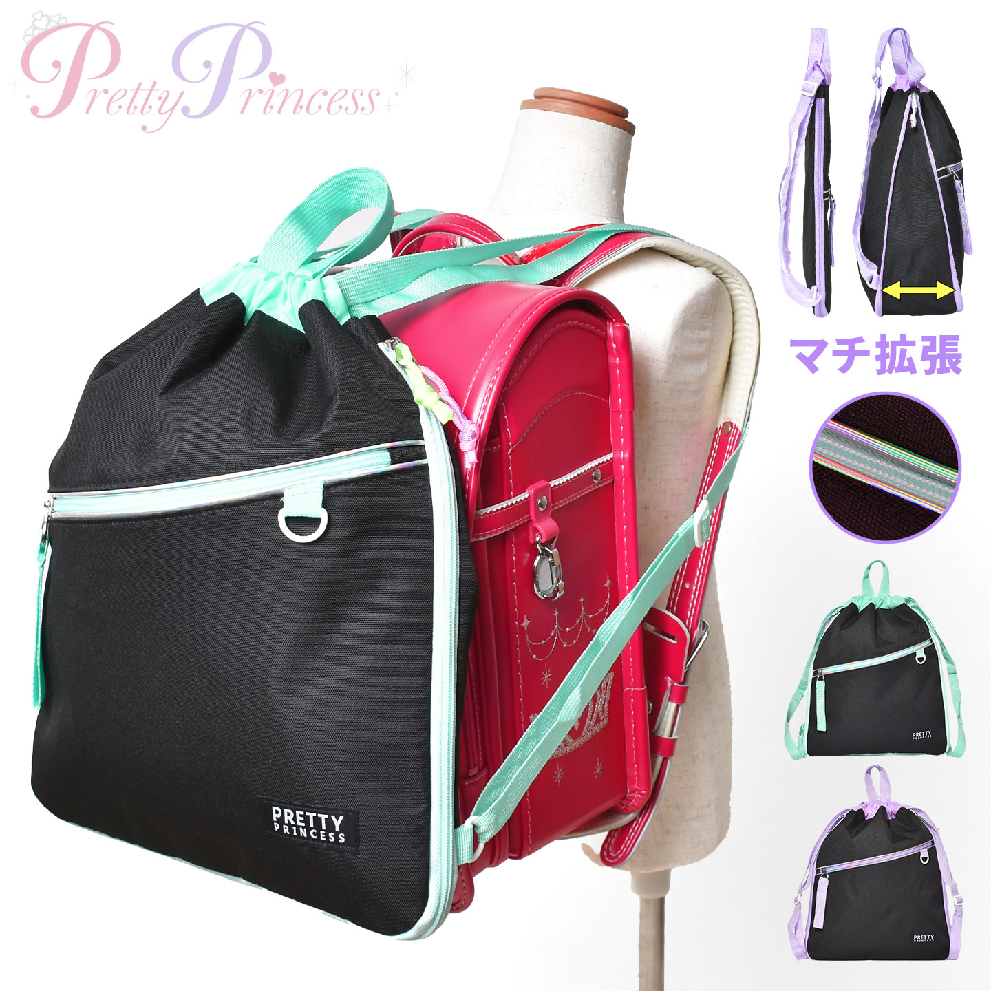 夜道で光を反射するタグ付きで、ネームタグは内側に付いていて安心◎長めの肩紐でランドセルの上から背負えます!