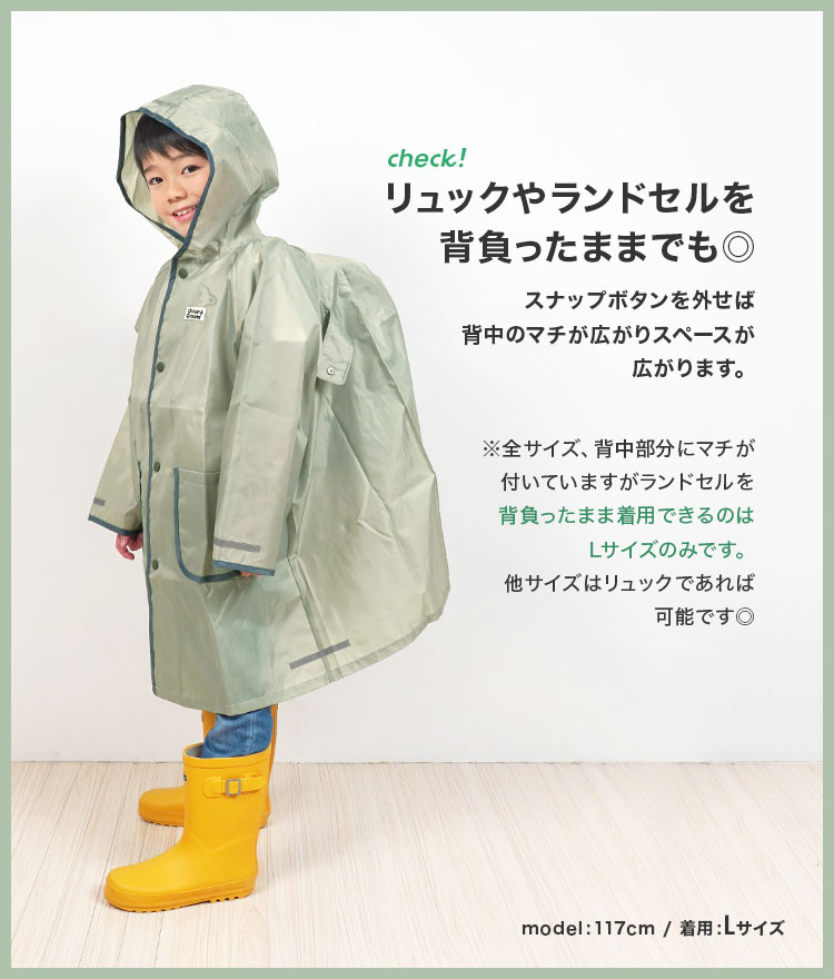 背中のボタンを外すとマチが広がりリュックやランドセルを背負ったままでも着用OK!(ランドセル対応なのはLサイズのみ)
