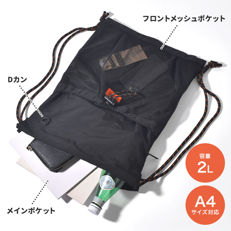 フロントには小物整理に便利なドローコード付きのメッシュポケット付き。