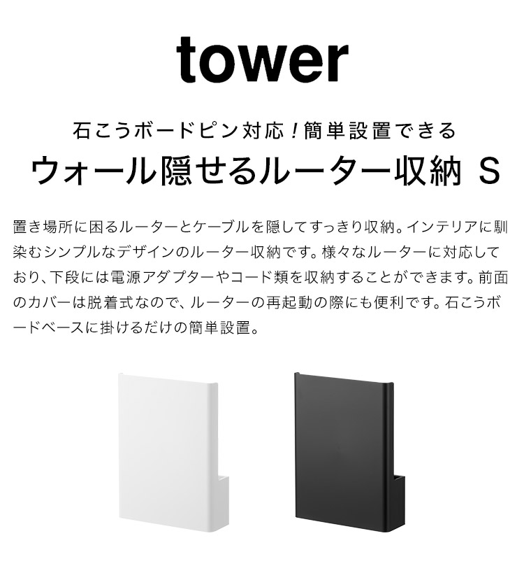 山崎実業 ウォール隠せるルーター収納 タワー Sサイズ 石こうボード壁対応 tower 10074 10075 ルーター 収納 ボックス 壁掛け スリム コンパクト アイデア wifi 隠し 壁面収納 ホワイト ブラック コンセント カバー 整理整頓 ケーブル アダプター コード 配線 隠す 簡単設置 2段 ルーターボックス コードボックス 着脱式 熱がこもりにくい 石こうボードピン 木ネジ 浮かせる収納 白 黒 収納ケース 蓋付き ケーブル隠し コード収納 ルーターラック コンセントボックス ケーブルボックス ホコリよけ シンプル スマート スタイリッシュ インテリア 馴染む リビング 薄型 省スペース yamazaki