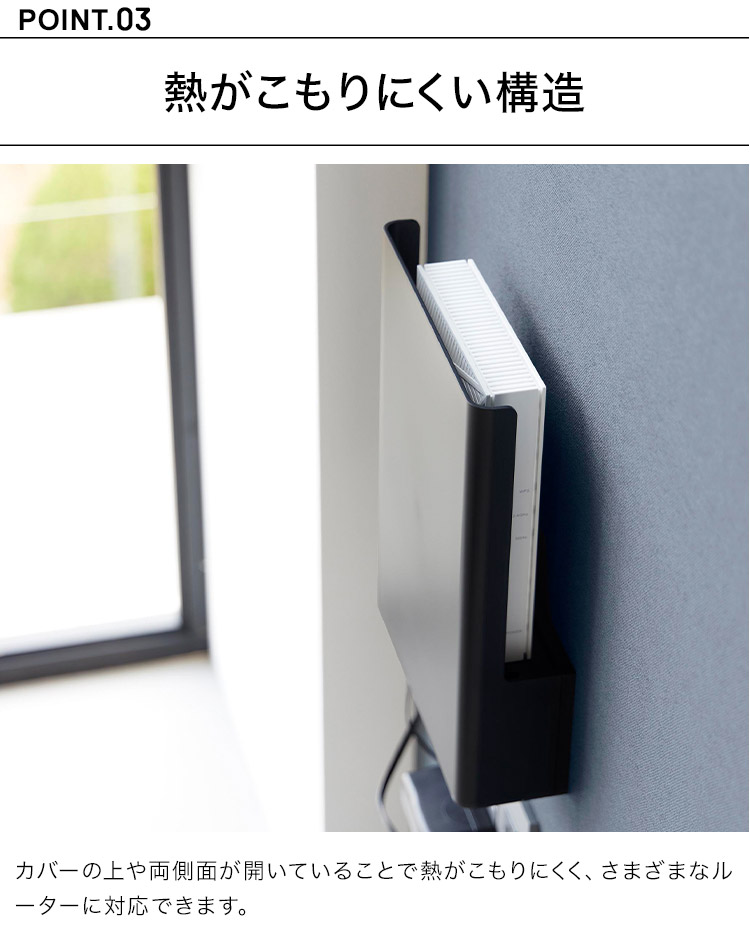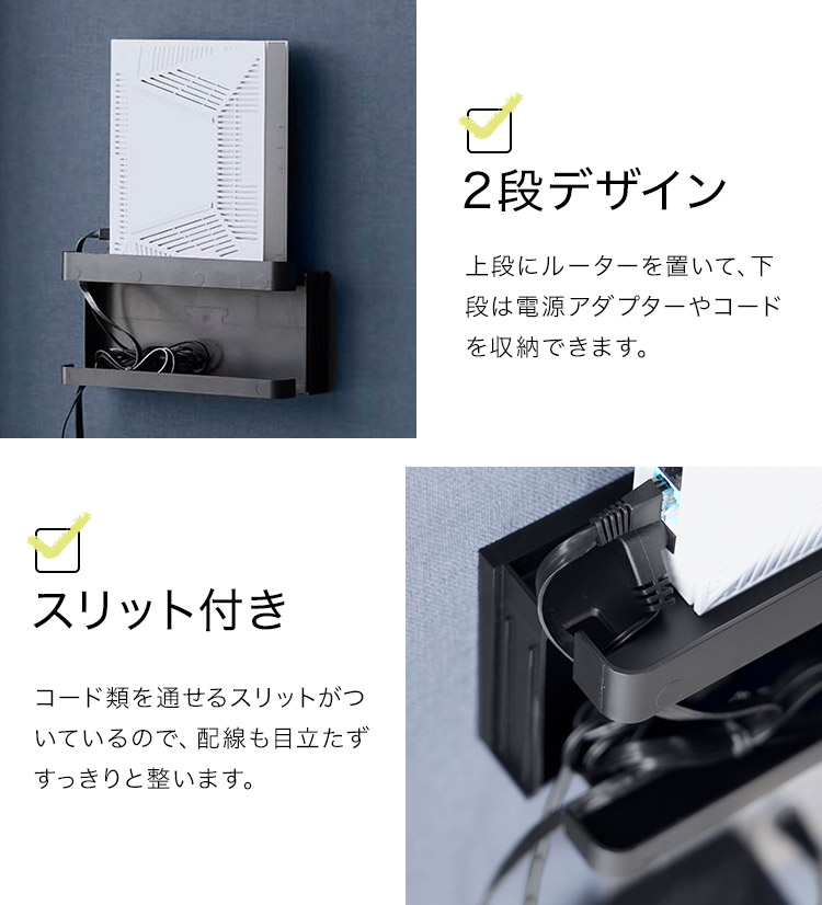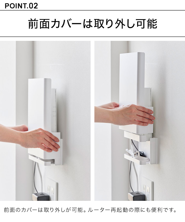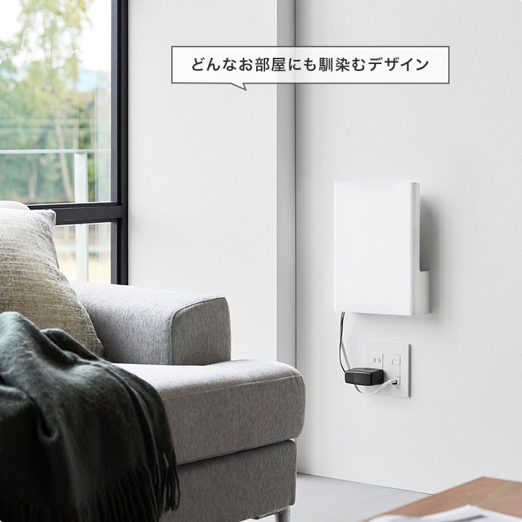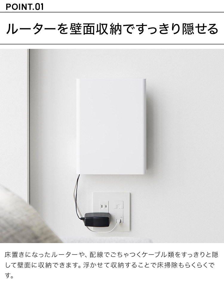 置き場所に困るルーターとケーブルを隠してすっきり収納。インテリアに馴染むシンプルなデザインのルーター収納です。様々なルーターに対応しており、下段には電源アダプターやコード類を収納することができます。前面のカバーは脱着式なので、ルーターの再起動の際にも便利です。石こうボードベースに掛けるだけの簡単設置。