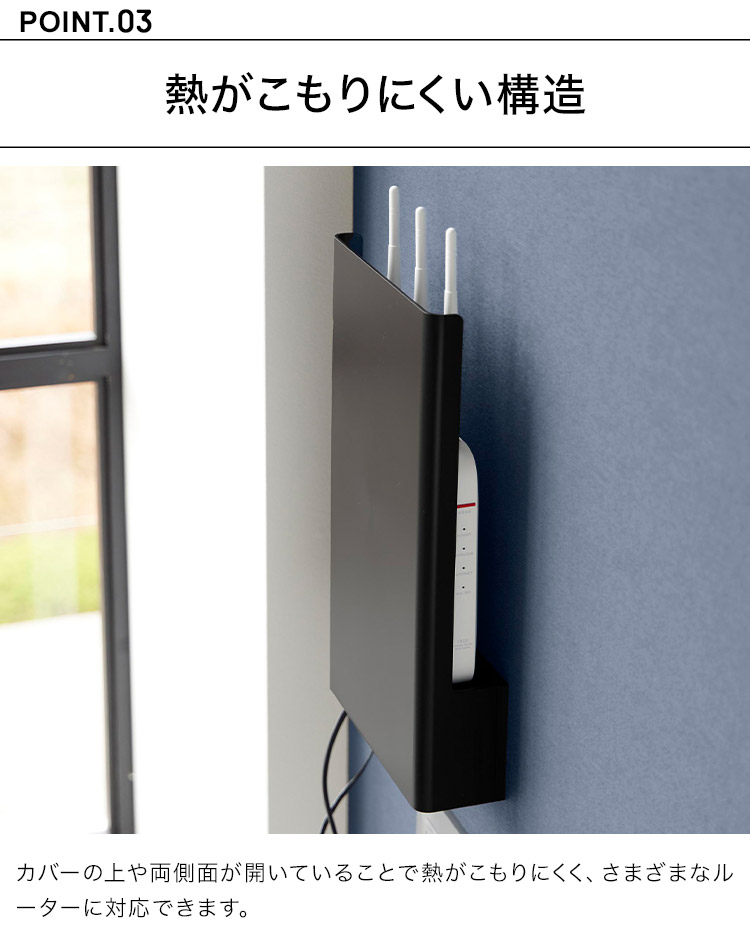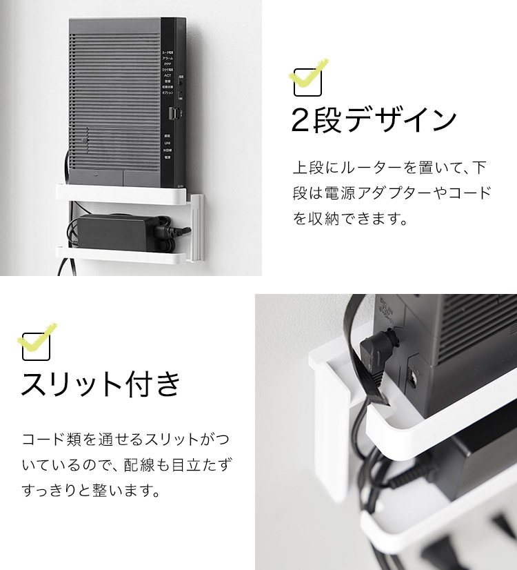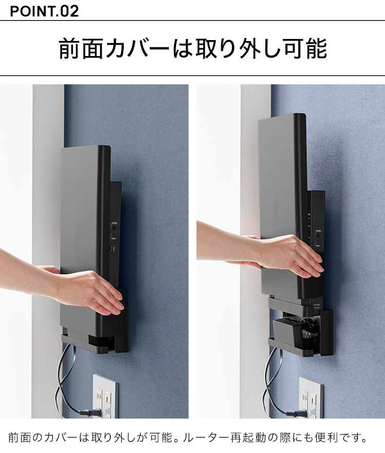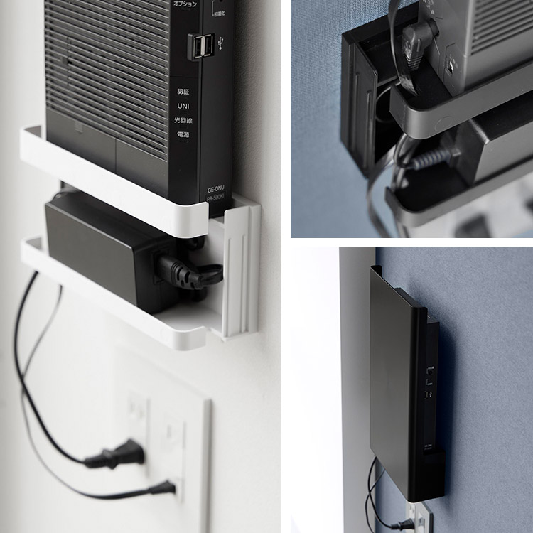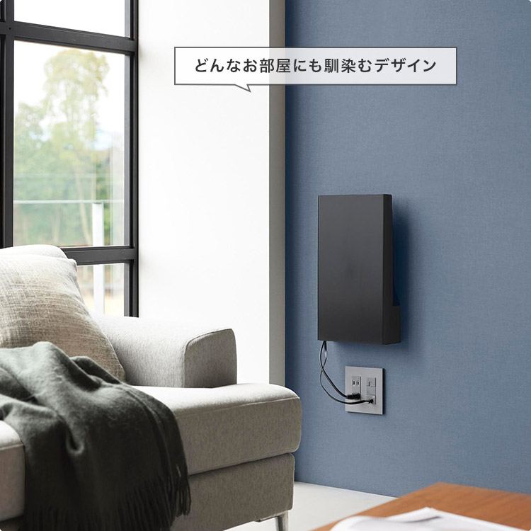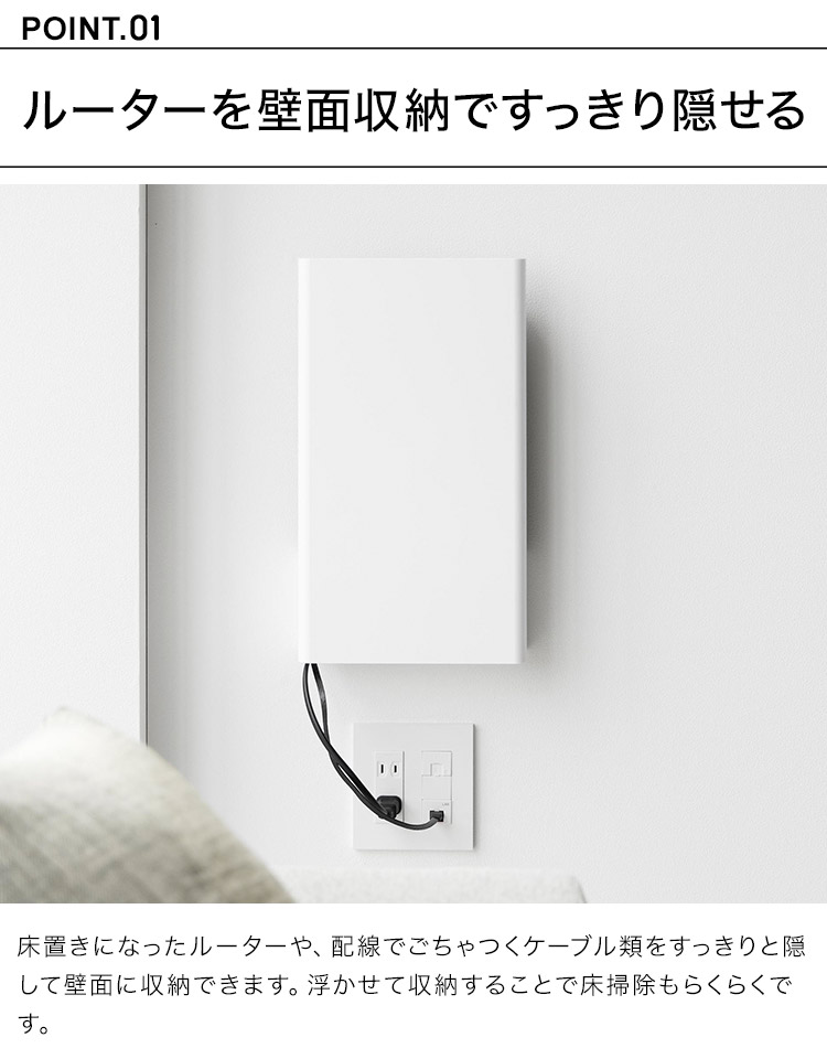 置き場所に困るルーターとケーブルを隠してすっきり収納。インテリアに馴染むシンプルなデザインのルーター収納です。様々なルーターに対応しており、下段には電源アダプターやコード類を収納することができます。前面のカバーは脱着式なので、ルーターの再起動の際にも便利です。石こうボードベースに掛けるだけの簡単設置。