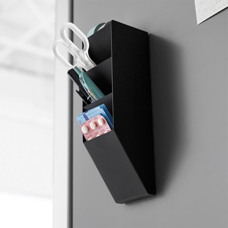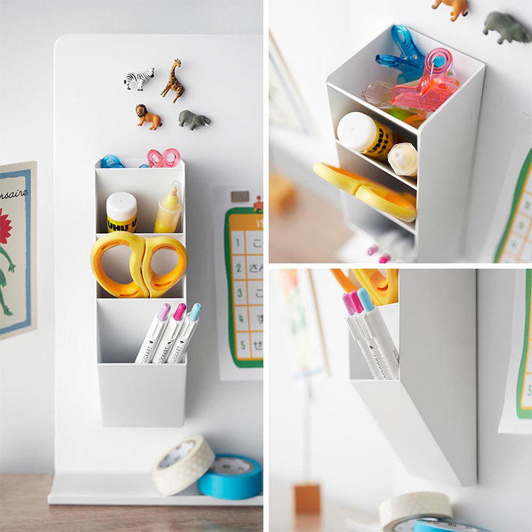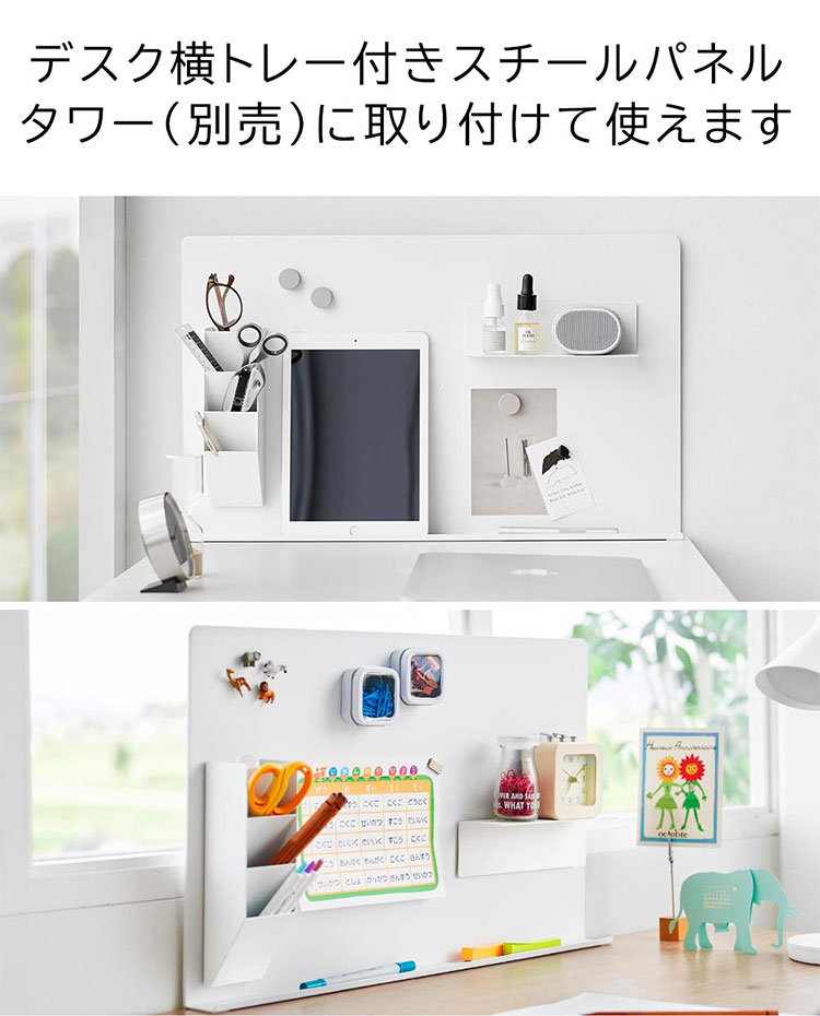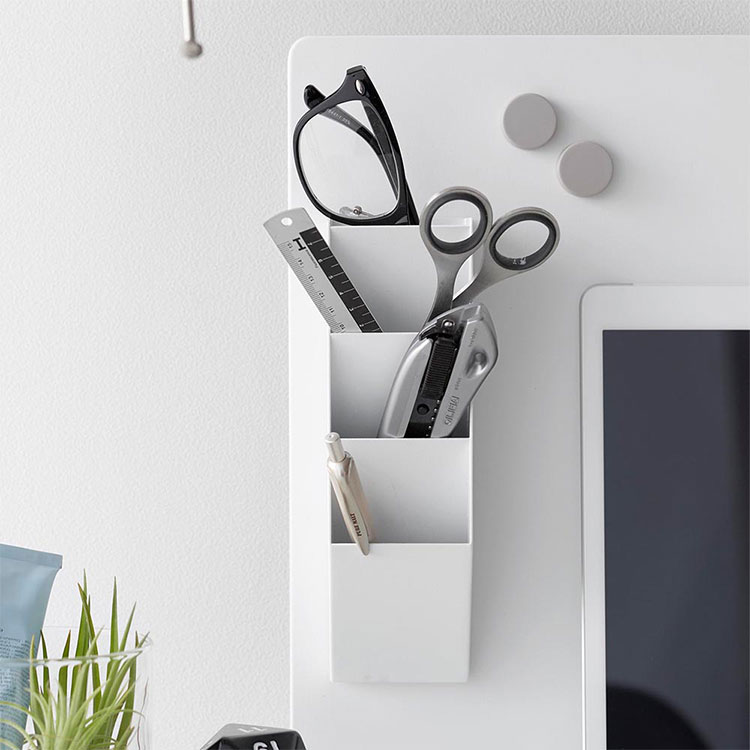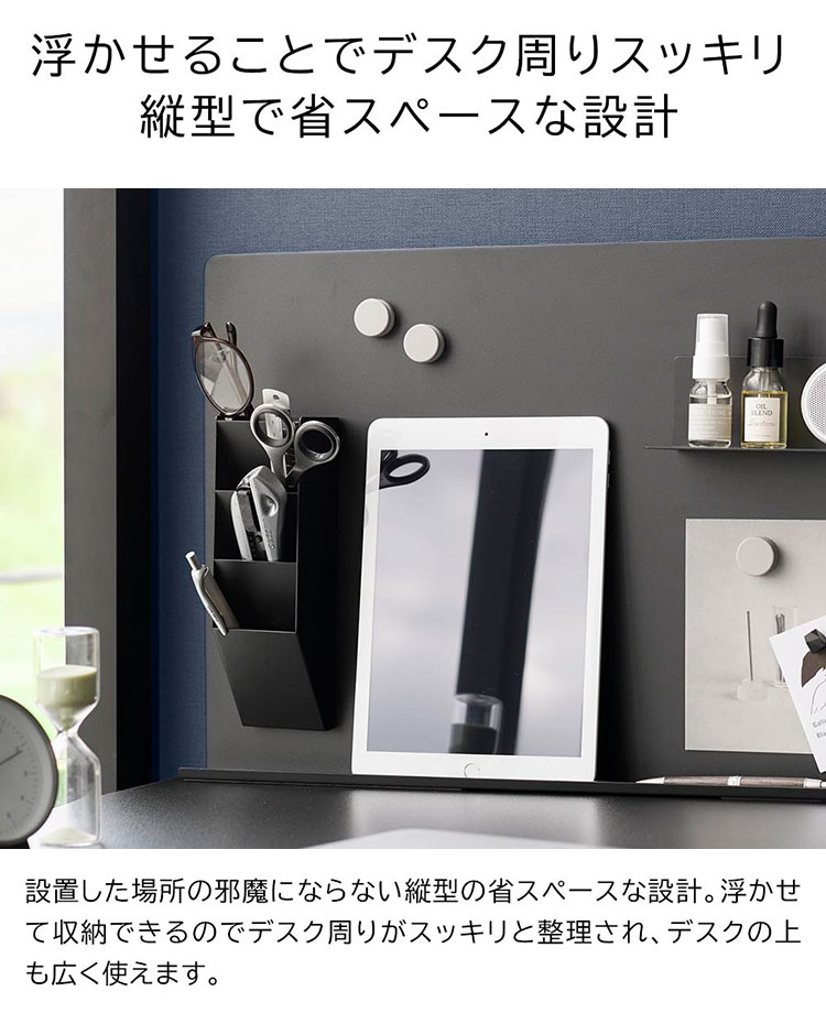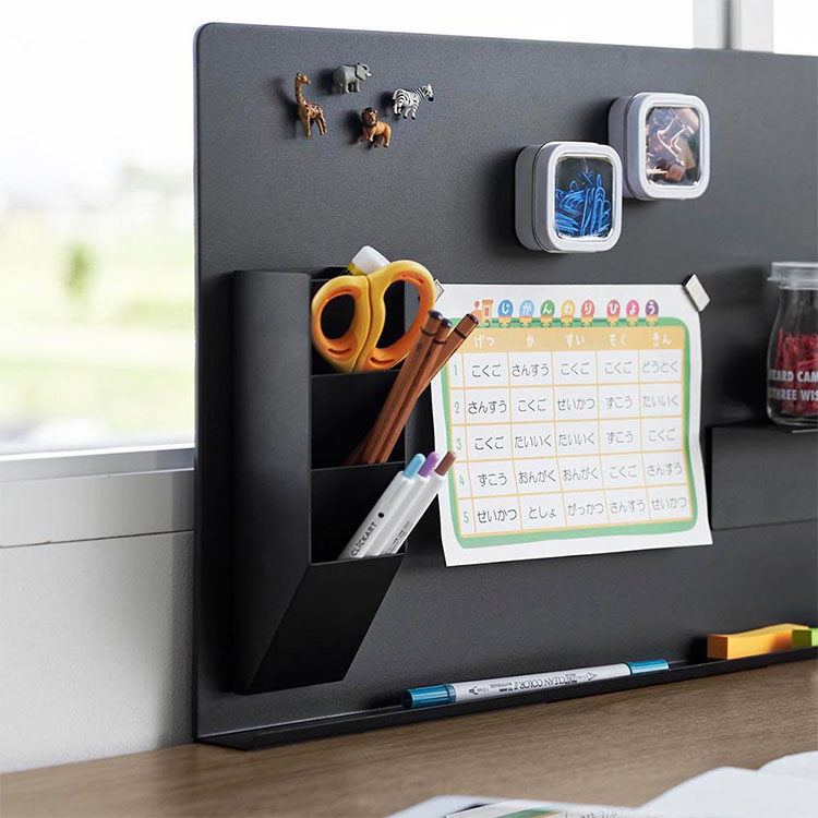 スチール壁面のお好みの場所に取り付けできる便利なペンスタンドです。別売りのデスク横トレー付きスチールパネル タワー(品番10066/10067)やマグネット棚 タワー スチールパネル対応(品番10094/10095)を一緒に使用すれば、デスク周りをスッキリ整理することができます。マスキングテープや薬などの小物を収納して、冷蔵庫横に取り付けるのもおすすめです。