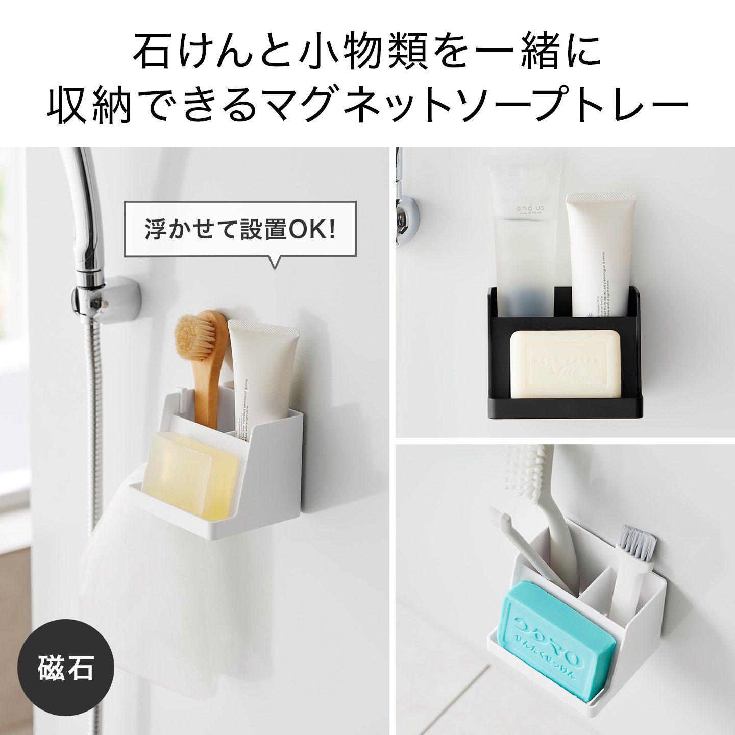 浮かせているから衛生的。小物も収納できるマグネットソープトレー