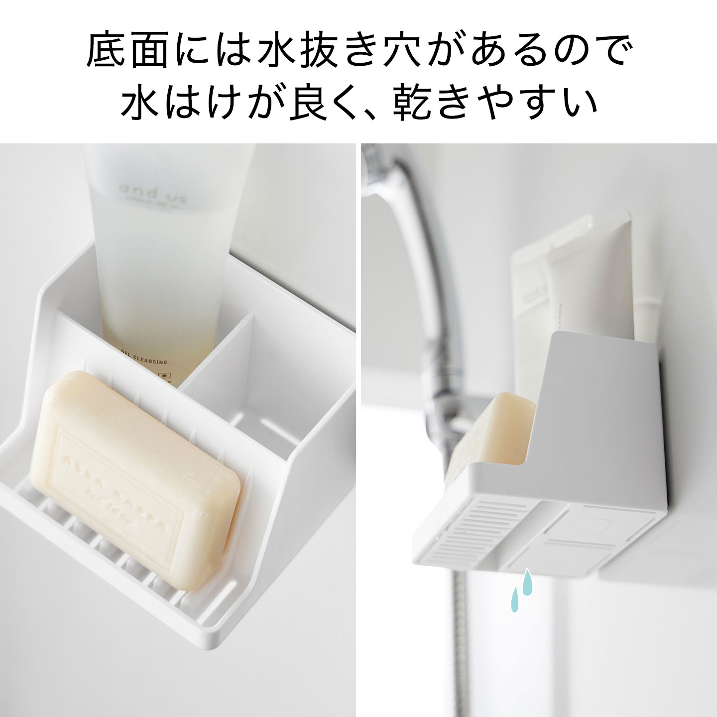 ソープトレーの側面と底面は凸凹のある形状で、底面にはスリット状の水抜き穴もあり、水切れと風通しが良く石けんが溶けにくいです。小物を収納するスペースにも水抜き穴があるので、水が溜まりにくく清潔に収納できます。