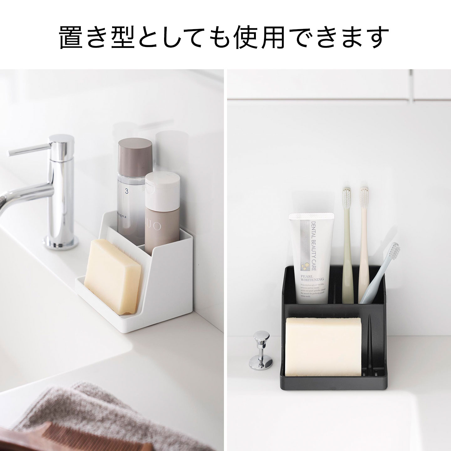 置き型としての使用もOK!本体の奥行きは9.8cmで石けんを立てて収納できるので、コンパクトに設置できます。