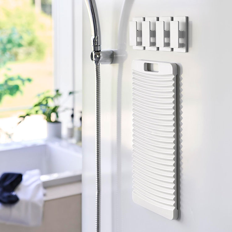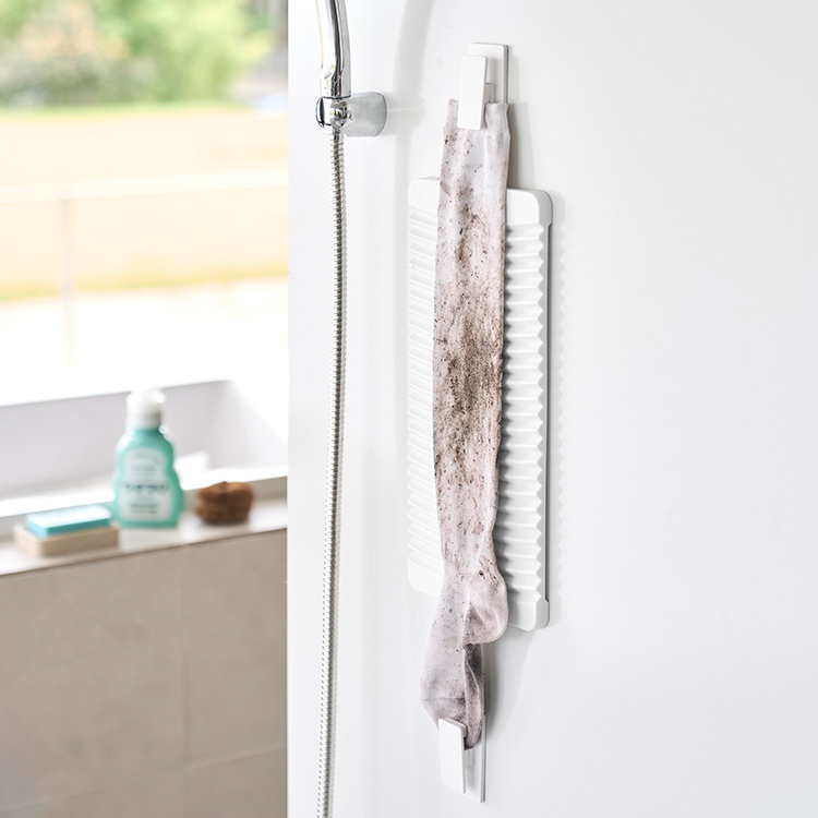 浴室の壁面に洗濯板をペタッと貼り付け、広げた洗濯物をマグネット付きクリップで固定すれば、擦り洗いがスムーズに。