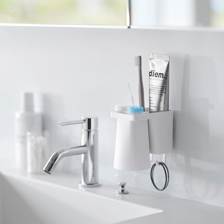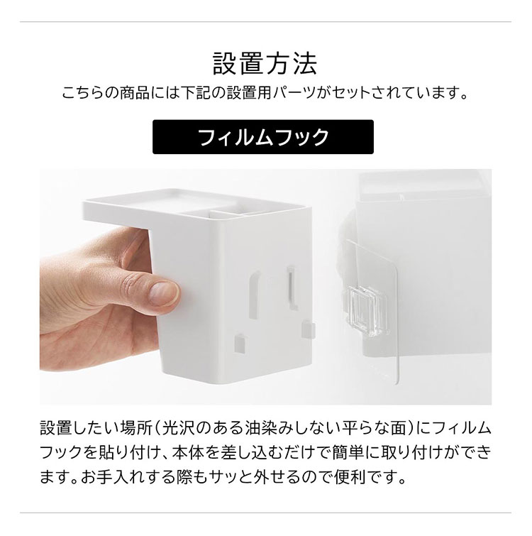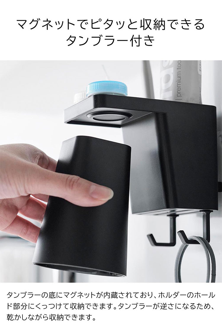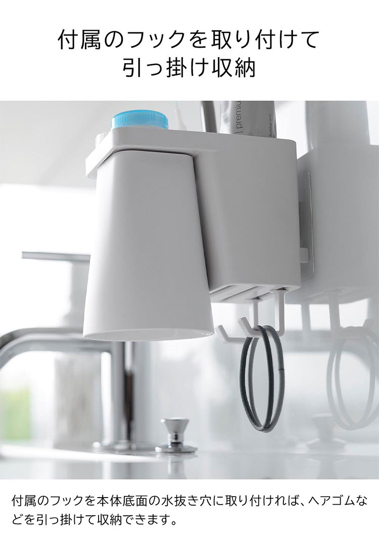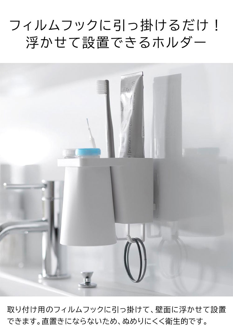 Details 【フィルムフック1人用歯ブラシホルダー&マグネットタンブラー】 フィルムフックでお好みの位置に簡単取り付け。1人分の歯磨きセット、歯間ブラシ、コンタクトレンズをまとめて収納できます。タンブラーはマグネットで浮かせて収納できるので乾きやすく衛生的。収納部の仕切り板も取り外し可能なのでお手入れが簡単です。水抜け穴に付属のフックを取り付ければ小物を掛けることもできます。貼り付けたフィルムフックに掛けるだけの簡単設置でタイルにも取り付け可能です。タンブラーはマグネットがつく設置面に直接収納することもできます。 ブランド名 tower / タワー JAN 4903208012959 / 4903208012966 品番 1295 / 1296 サイズ [外寸] 本体:W7×D12×H10.4cm ( タンブラー含む・フィルムフック含まず ) タンブラー:W7×D7×H9.5cm フィルムフック接着面:W6×H6cm [内寸] 収納部:W6.2×D3.6×H7.6cm 耐荷重 本体:約1kg フック1つあたり:約250g 重量 約155g 素材 本体:ABS樹脂・スチール・シリコーンゴム タンブラー:ABS樹脂・マグネット フィルムフック:ポリカーボネート・PET・ポリウレタン 耐冷・耐熱温度 [本体] 耐冷:-40℃ / 耐熱:90℃ [フィルムフック] 耐冷:-40℃ / 耐熱:60℃ 使用できる面 光沢のある平らな油染みしない面で、フィルムフックの接着面よりも大きい面(タイル・プラスチック・ステンレス・ガラス・金属塗装面・人工大理石) 付属品 仕切り:フック×2 生産国 中国 ご注意 ※表記サイズより、多少の誤差があることがございます。 ※商品の画像はできる限り実物に近づけるよう配慮しておりますが、お使いのモニターやご覧になる環境によりましてはカラーの見え方に差が出る場合がございます。ご了承くださいませ。 関連キーワード フィルムフック1人用歯ブラシホルダー&マグネットタンブラー 山崎実業 タワー tower 歯ブラシ 立て 置き 歯磨き粉 収納 チューブ コップ タンブラー コンタクト 浮かせる収納 まとめる 洗面所 おしゃれ シンプル ホワイト ブラック 1295 1296 公式 壁面収納 スタイリッシュ 水垢 水アカ 防止 省スペース コンパクト 整理整頓 洗面用品 フック 吊り下げ フィルムフック 浴室 バスルーム サニタリー 水場 洗面台 白 黒 便利 小物 浮く 置き場 衛生的 収納 新生活 賃貸OK 一人暮らし yamazaki 山実 やまじつ ヤマジツ やまざきじつぎょう たわー towerシリーズ ブランド | |||||||||||||