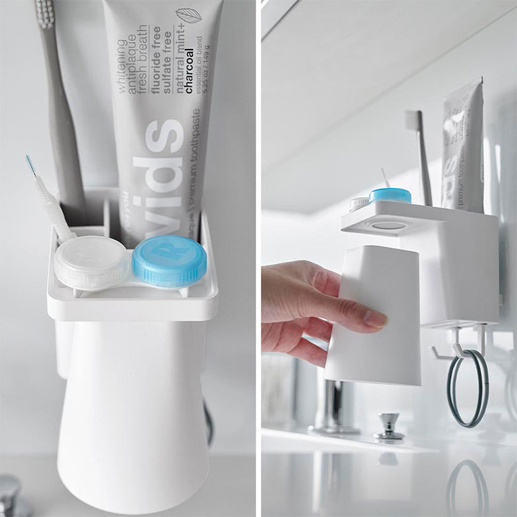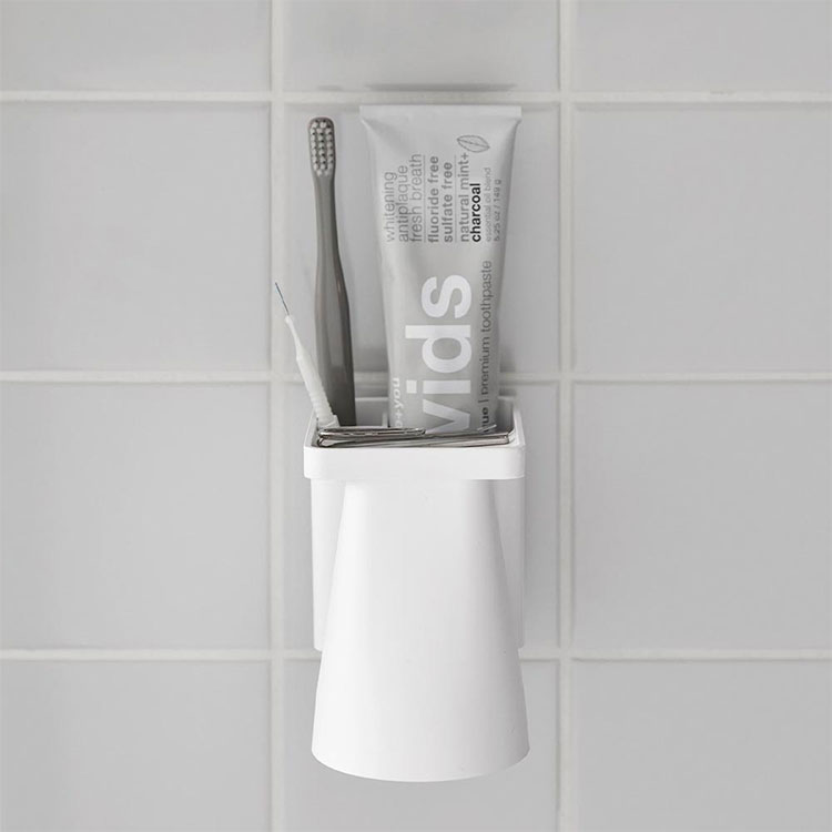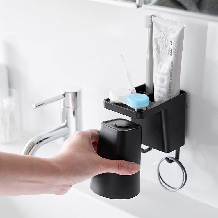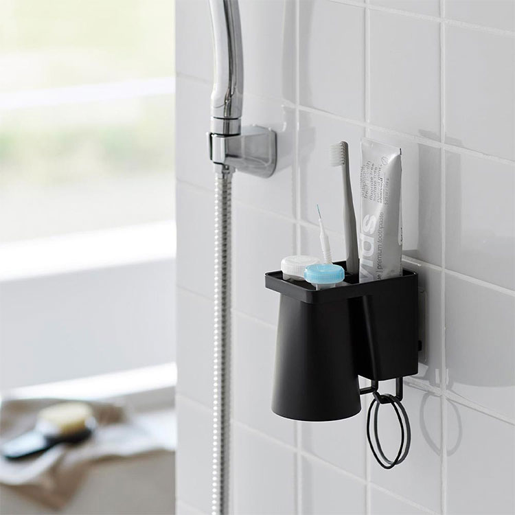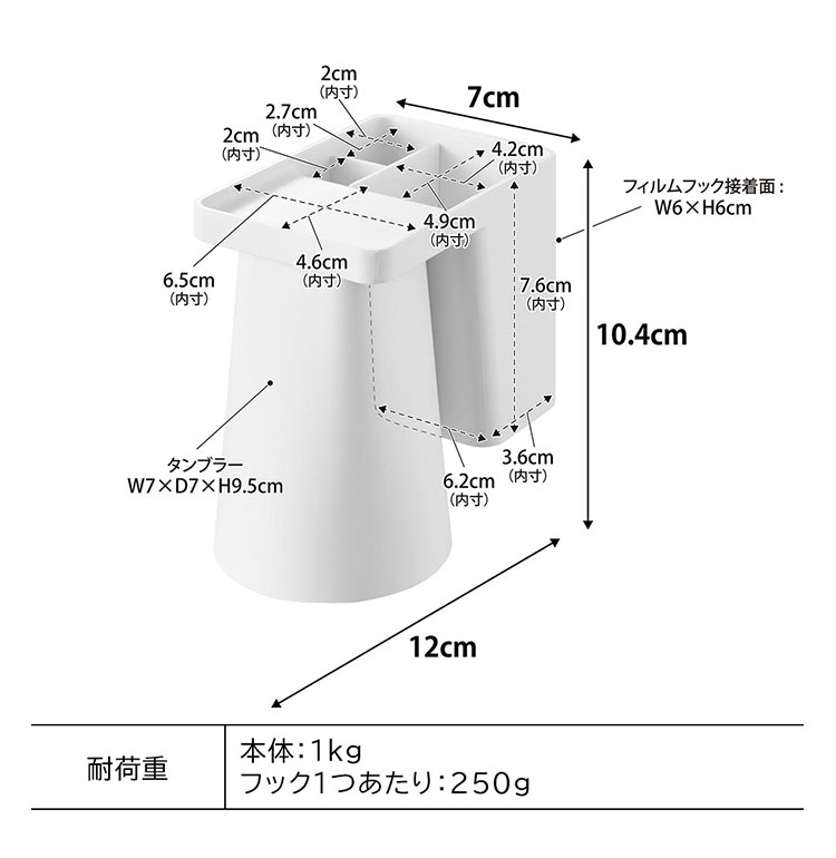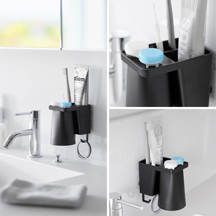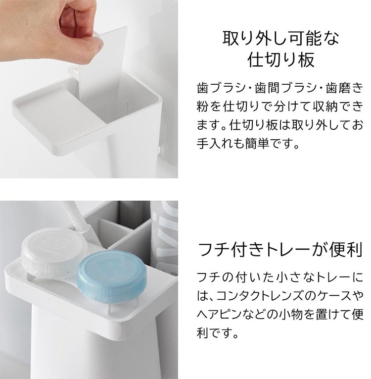 Details 【フィルムフック1人用歯ブラシホルダー&マグネットタンブラー】 フィルムフックでお好みの位置に簡単取り付け。1人分の歯磨きセット、歯間ブラシ、コンタクトレンズをまとめて収納できます。タンブラーはマグネットで浮かせて収納できるので乾きやすく衛生的。収納部の仕切り板も取り外し可能なのでお手入れが簡単です。水抜け穴に付属のフックを取り付ければ小物を掛けることもできます。貼り付けたフィルムフックに掛けるだけの簡単設置でタイルにも取り付け可能です。タンブラーはマグネットがつく設置面に直接収納することもできます。 ブランド名 tower / タワー JAN 4903208012959 / 4903208012966 品番 1295 / 1296 サイズ [外寸] 本体:W7×D12×H10.4cm ( タンブラー含む・フィルムフック含まず ) タンブラー:W7×D7×H9.5cm フィルムフック接着面:W6×H6cm [内寸] 収納部:W6.2×D3.6×H7.6cm 耐荷重 本体:約1kg フック1つあたり:約250g 重量 約155g 素材 本体:ABS樹脂・スチール・シリコーンゴム タンブラー:ABS樹脂・マグネット フィルムフック:ポリカーボネート・PET・ポリウレタン 耐冷・耐熱温度 [本体] 耐冷:-40℃ / 耐熱:90℃ [フィルムフック] 耐冷:-40℃ / 耐熱:60℃ 使用できる面 光沢のある平らな油染みしない面で、フィルムフックの接着面よりも大きい面(タイル・プラスチック・ステンレス・ガラス・金属塗装面・人工大理石) 付属品 仕切り:フック×2 生産国 中国 ご注意 ※表記サイズより、多少の誤差があることがございます。 ※商品の画像はできる限り実物に近づけるよう配慮しておりますが、お使いのモニターやご覧になる環境によりましてはカラーの見え方に差が出る場合がございます。ご了承くださいませ。 関連キーワード フィルムフック1人用歯ブラシホルダー&マグネットタンブラー 山崎実業 タワー tower 歯ブラシ 立て 置き 歯磨き粉 収納 チューブ コップ タンブラー コンタクト 浮かせる収納 まとめる 洗面所 おしゃれ シンプル ホワイト ブラック 1295 1296 公式 壁面収納 スタイリッシュ 水垢 水アカ 防止 省スペース コンパクト 整理整頓 洗面用品 フック 吊り下げ フィルムフック 浴室 バスルーム サニタリー 水場 洗面台 白 黒 便利 小物 浮く 置き場 衛生的 収納 新生活 賃貸OK 一人暮らし yamazaki 山実 やまじつ ヤマジツ やまざきじつぎょう たわー towerシリーズ ブランド | |||||||||||||