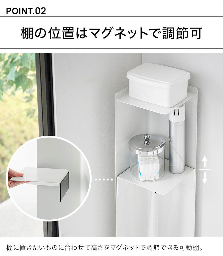 トイレ用品を隠して収納できるキャスター付きスリムトイレラック。狭いスペースでクルっと回転できます。移動がスムーズなキャスター付きで掃除もしやすく、外からは見えないスッキリしたデザインです。マグネット付きの棚板は高さを自由に変えられ、長いトイレブラシも収納可能。