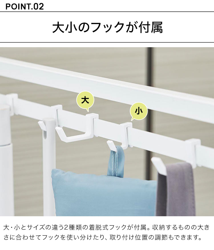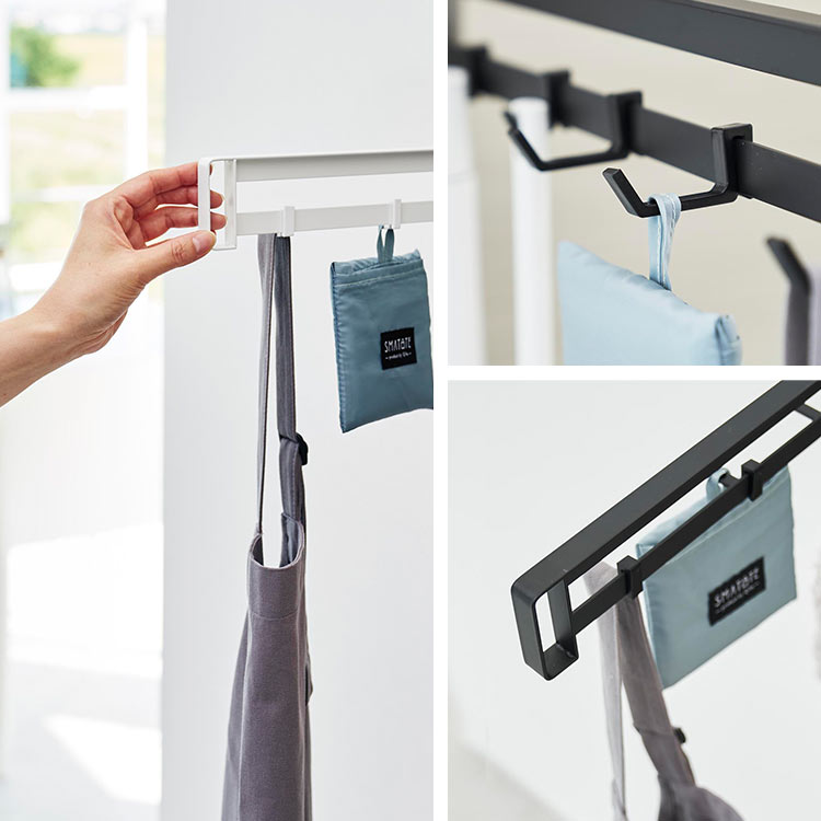 冷蔵庫横の隙間を有効活用!必要な時だけ引き出せるスライドフック。マグネットで冷蔵庫横に簡単取り付けできます。冷蔵庫横に、フロアワイパーやハンディモップなどの掃除用品や、エプロンやエコバッグなどのキッチン小物をかけて収納できます。収納する物に合わせて使い分けできる大小2種類のフックが付属。冷蔵庫専用。