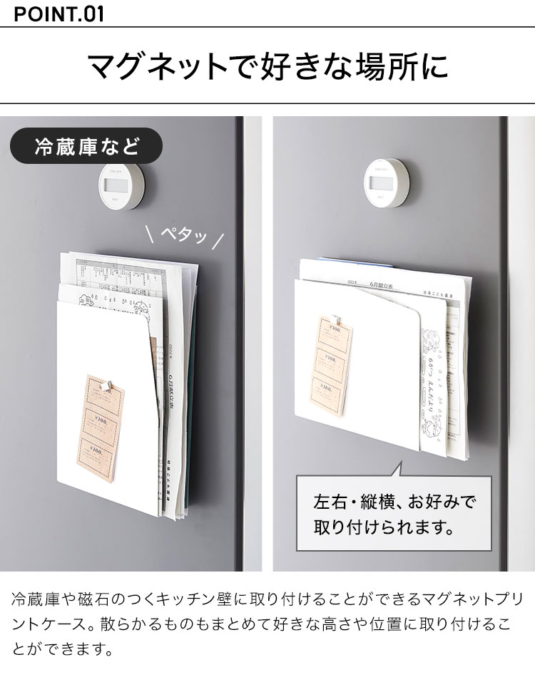 お好みの向きを選んでマグネットで簡単取り付け!散らかる物をまとめて収納できるプリントケース。マグネットは左右どちらの面にも貼り付けられるので、お好みの向きで使用できます。横向きに設置しても出し入れがしやすい形状で立てて置いても使用可能。スリムなのでちょっとした隙間を有効活用できます。倒して置いても使用可能。本体上部に小物を収納できます。スチール製なのでメモなどを貼り付けが可能です。