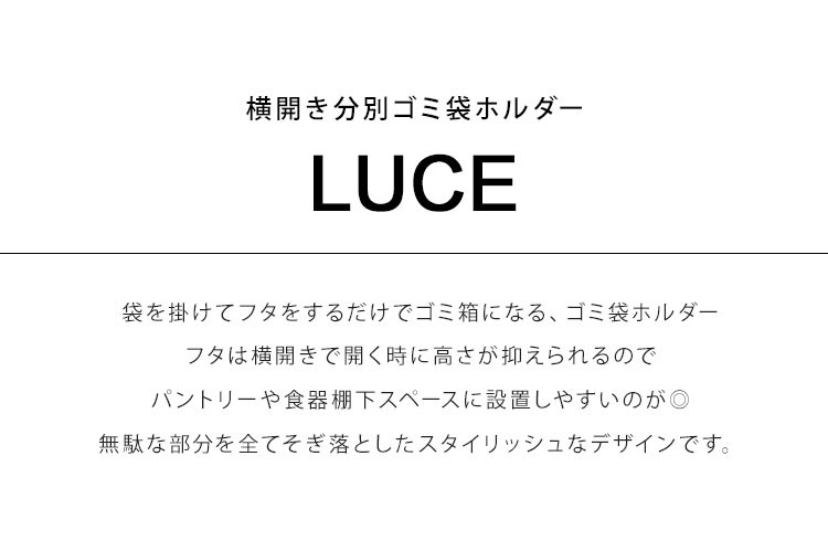 ![]() ![]() ![]() ![]() ![]() ![]() ![]() ![]() ![]() ![]() ![]() ![]() ![]() ![]() ![]() ![]() Details 【横開き分別ゴミ袋ホルダー】 袋を掛けてフタをするだけでゴミ袋になる、luceの分別ゴミ袋ホルダーフタは横開きで開く時に高さが抑えられるのでパントリーや食器棚下スペースに設置しやすいのが◎無駄な部分をそぎ落としたスタイリッシュなデザインです。 ブランド名 LUCE/ルーチェ 品番 4907/4908 サイズ ■本体:約高さ56×幅22×奥行34cm □フタ開口部:約高さ29×幅19cm □フタ開口時の高さ:約高さ77cm 重量 約1.3kg 素材 本体:スチール(粉体塗装) フタ:ポリプロピレン 生産国 中国 仕様 対応サイズ:30〜45L用のポリ袋 耐熱温度:約80度・耐冷温度:約-40度 付属品 緩衝材×4・六角レンチ 備考 組立式 ご注意 ※表記サイズより、多少の誤差があることがございます。 ※商品の画像はできる限り実物に近づけるよう配慮しておりますが、お使いのモニターやご覧になる環境によりましてはカラーの見え方に差が出る場合がございます。ご了承くださいませ。 |