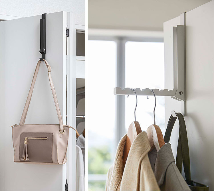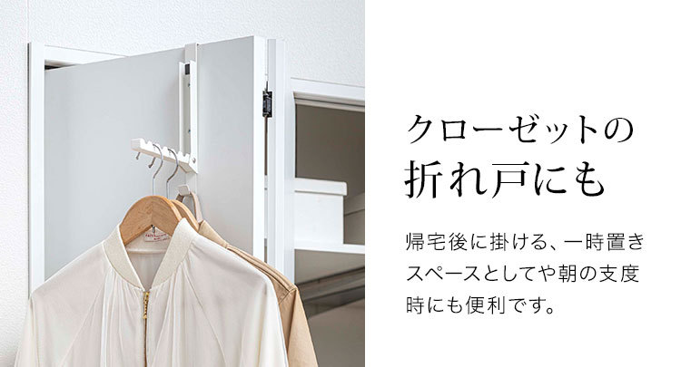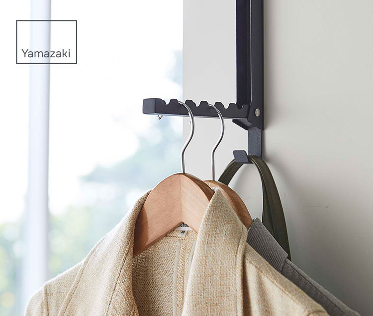 使わない時はコンパクトに折りたたんで収納できる6連式ドアハンガーです。よく使うコートやバッグの一時置きや、お客様用のコートハンガーにも便利です!お家のドアやクローゼットに引っ掛けるだけで簡単に設置することができます。付属の木ネジで壁面に直接取り付けも可能です。