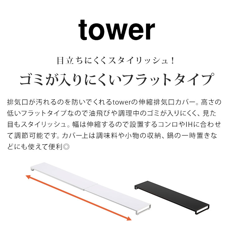 排気口カバー フラットタイプ tower 5732 5733 ガスコンロ 排気口ガード 42.5〜75cm対応 タワー IH ブラック 伸縮 洗える おしゃれ 山崎実業 油はね ガード