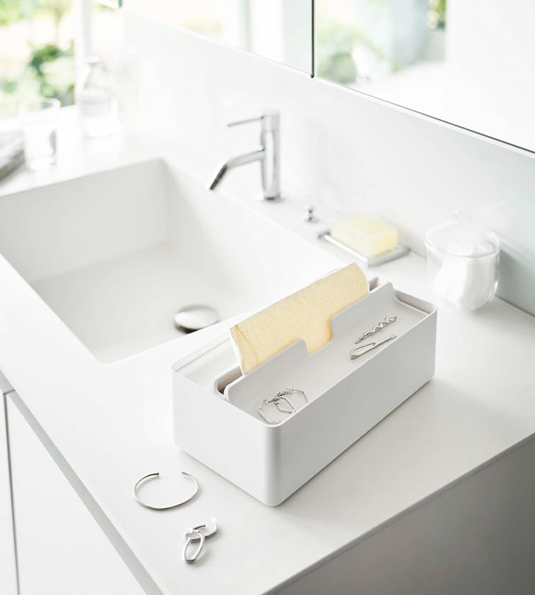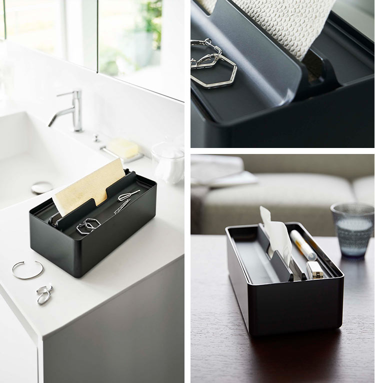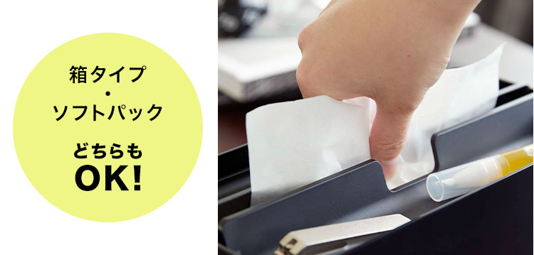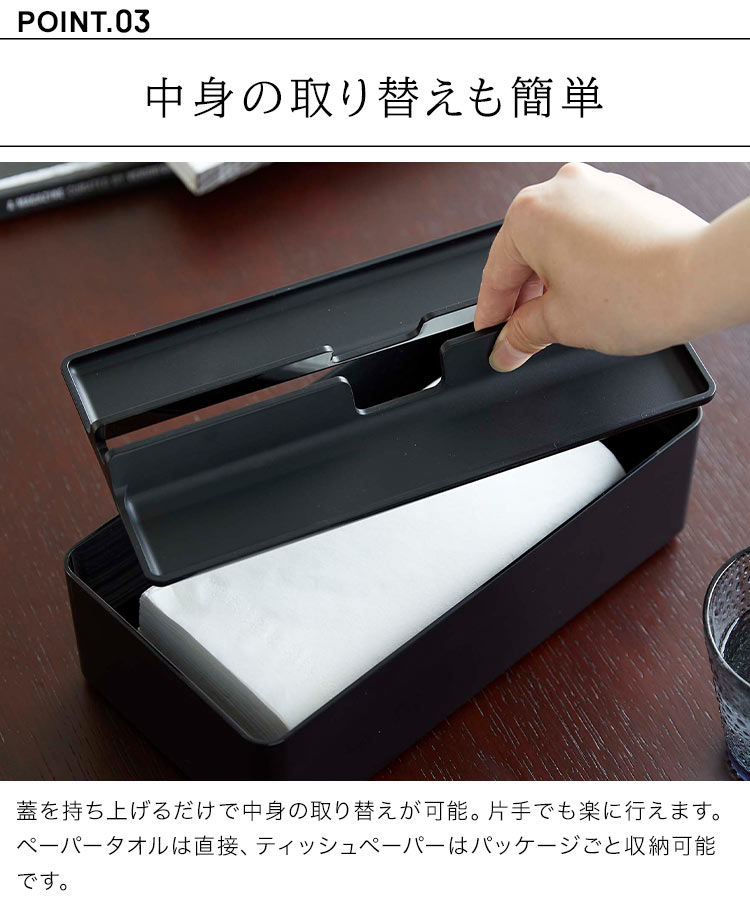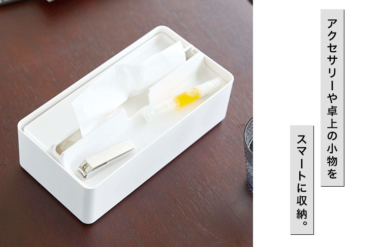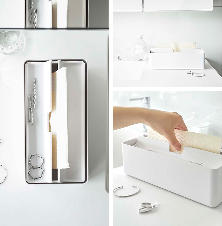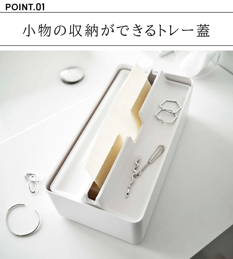 小物の一時置きができる便利なトレー付きペーパータオルケース。箱タイプ・ソフトパックのティッシュにも対応。蓋はトレーになっているのでアクセサリーなどの小物も収納可能です。紙が取り出しやすい構造だからスムーズに取り出せます。蓋を持ち上げるだけで中身の取り替えも簡単です。
