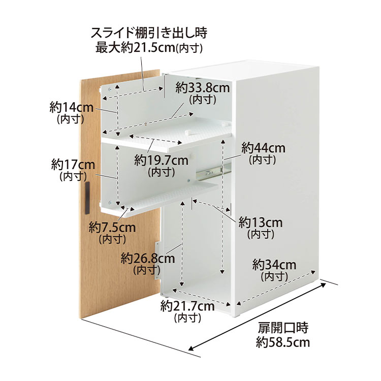 スライド棚下段から底面までの収納部:約約H26.8×W8.7×D34cm