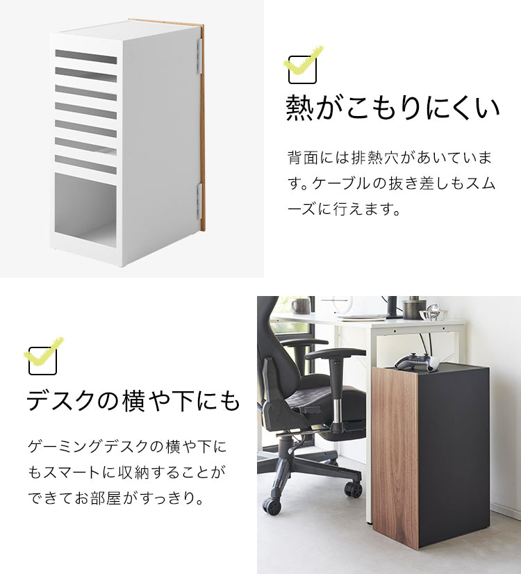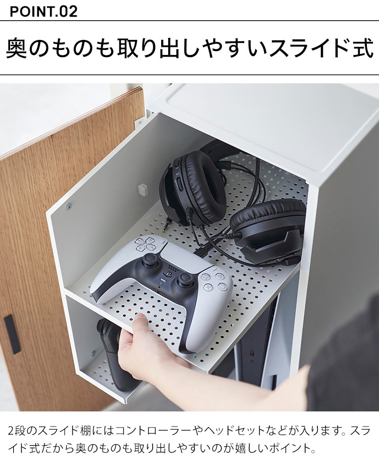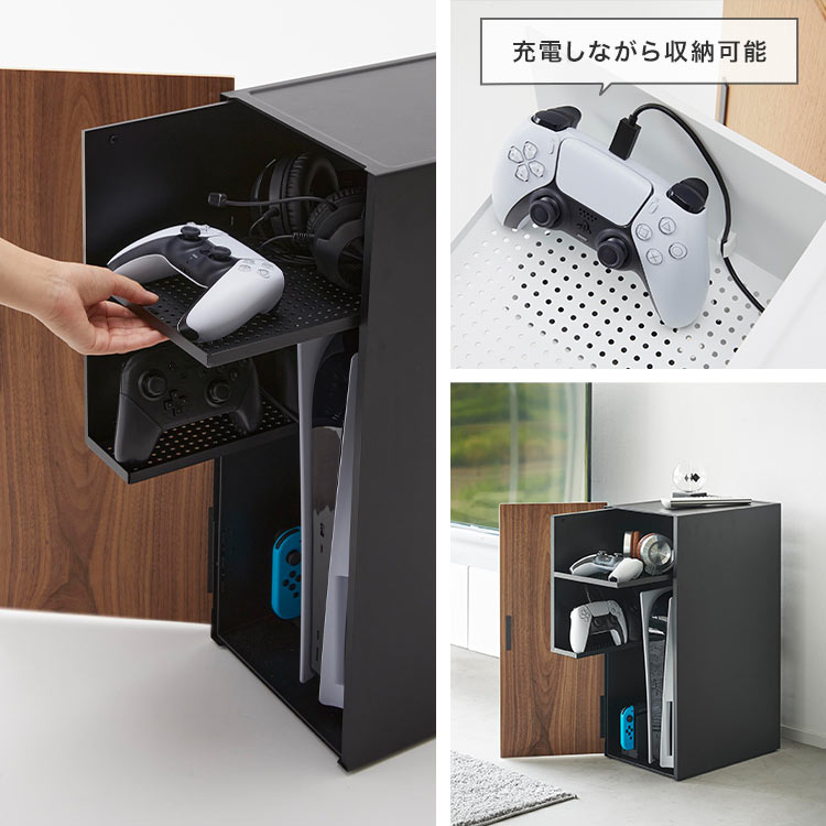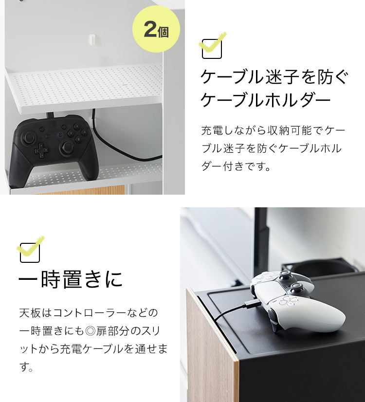 ゲーム機やコントローラーを隠してすっきり収納できる機能的なラック。リビングなどで雑然としがちなゲーム機やコントローラーなどを隠しながら美しく収納できる大容量のラックです。棚は引き出し式になっていて奥の方に置いた物も取り出しやすい。上部の棚はコントローラーを2つ並べても余裕のある広さ。シリコーンのケーブルホルダー付き。蓋との間にスリットがあり、充電しながら天板にコントローラーを一時置きできます。裏は排熱穴がたくさん空いていてケーブルの抜き差しもスムーズ。