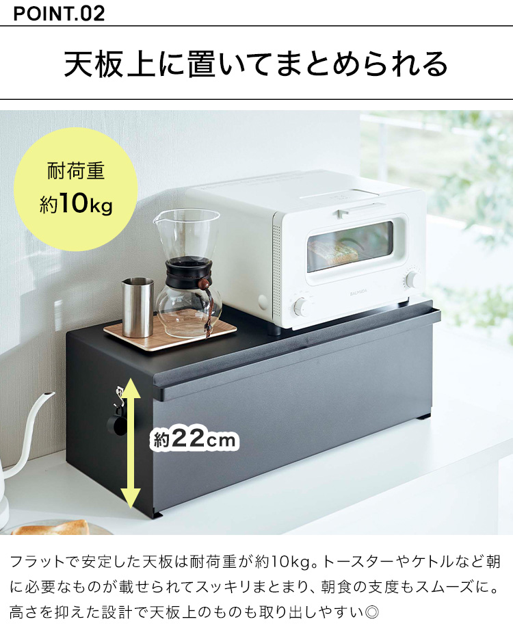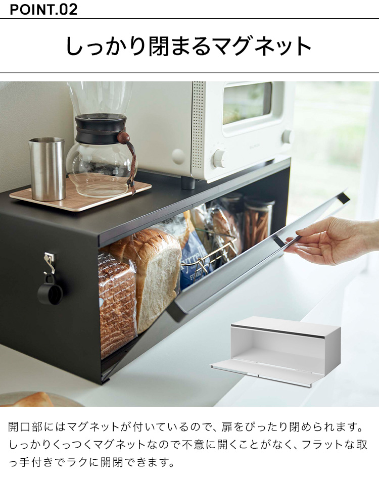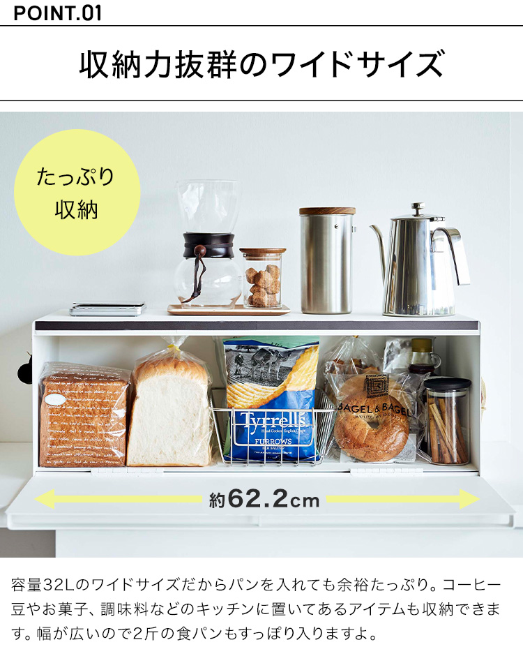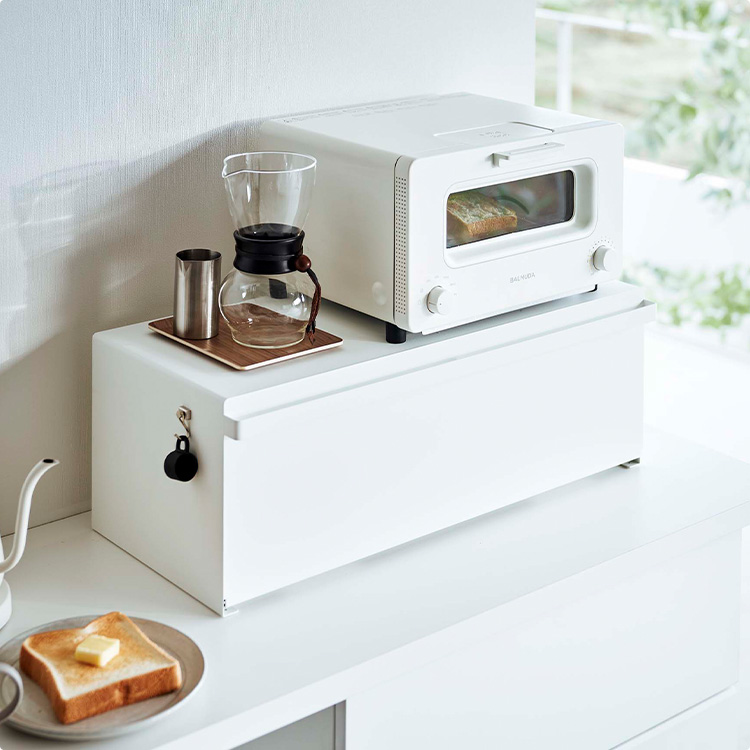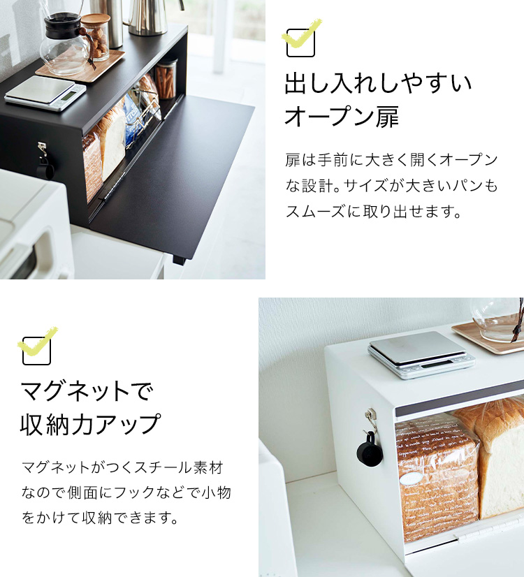パンや調味料、紅茶などをすっきりとまとめて収納できる32Lのワイドなブレッドケース。キッチンカウンターなどで雑然としがちなパンやお菓子、調味料などを隠しながら美しく収納できる収納ケースです。フラットな天板の上にはトースターなどを置くこともでき、朝食の準備もスムーズになります。マグネットがつくスチール素材なので側面にフックなどで小物をかけて収納できます。