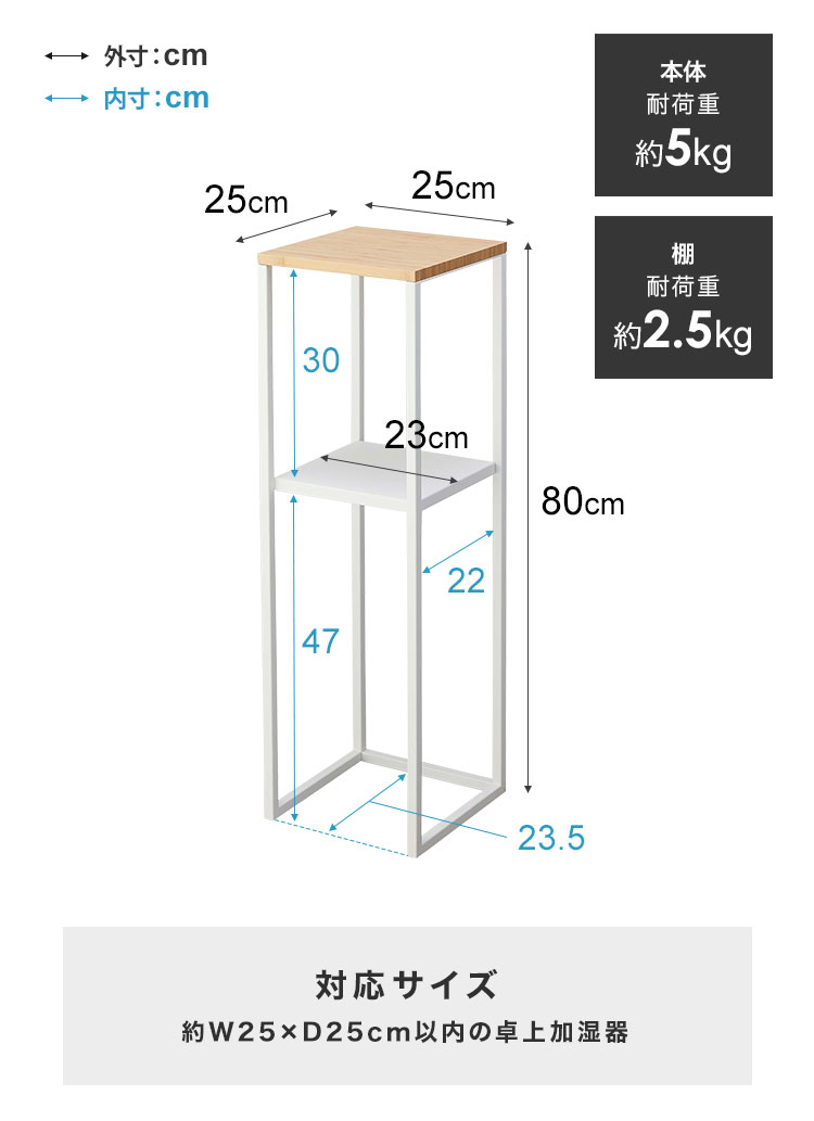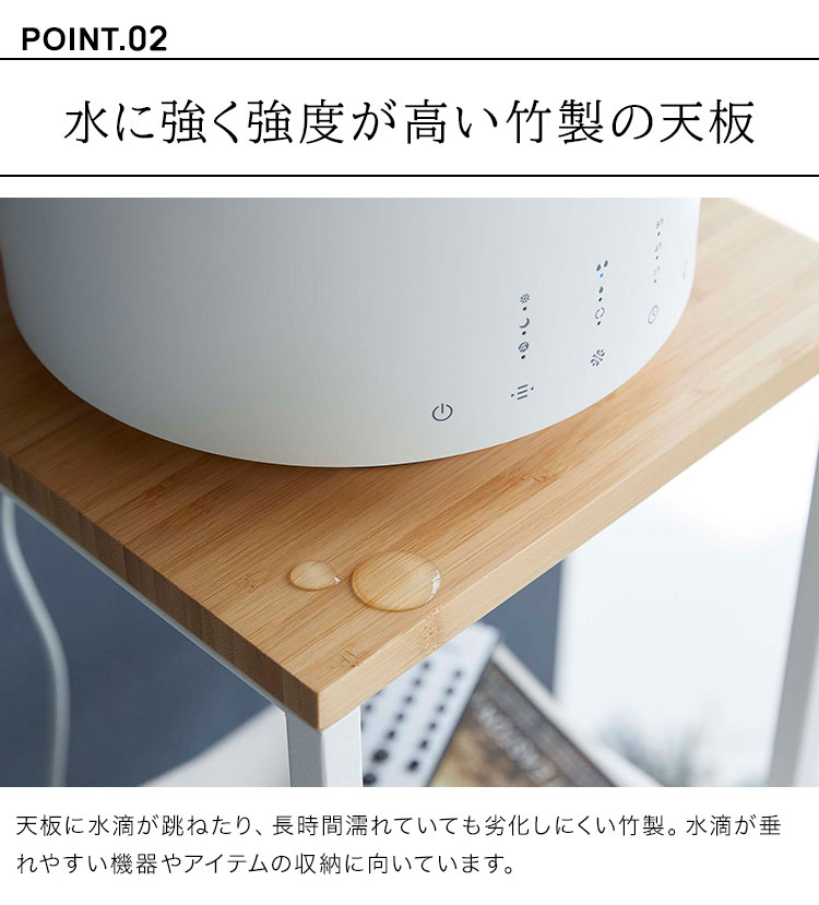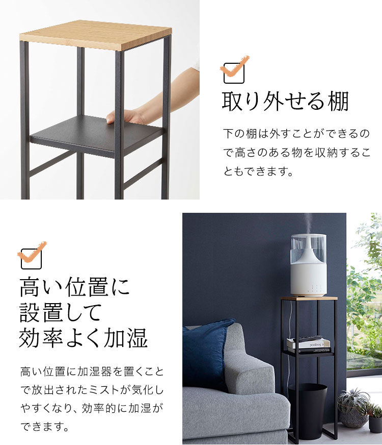 高い位置に加湿器を置くことで放出されたミストが気化しやすくなり、効率的に加湿ができるtowerの加湿器スタンド。水に強い竹製の天板を使用しているので、水気のある観葉植物やアルコールなどの除菌グッズを置くスタンドとしてもオススメです。他にもインテリア小物を飾ったりベッドサイドに設置するなど色んなシーンで使いやすいデザインです。