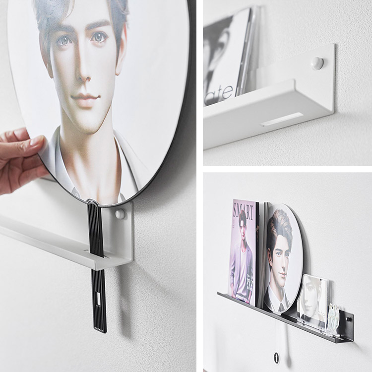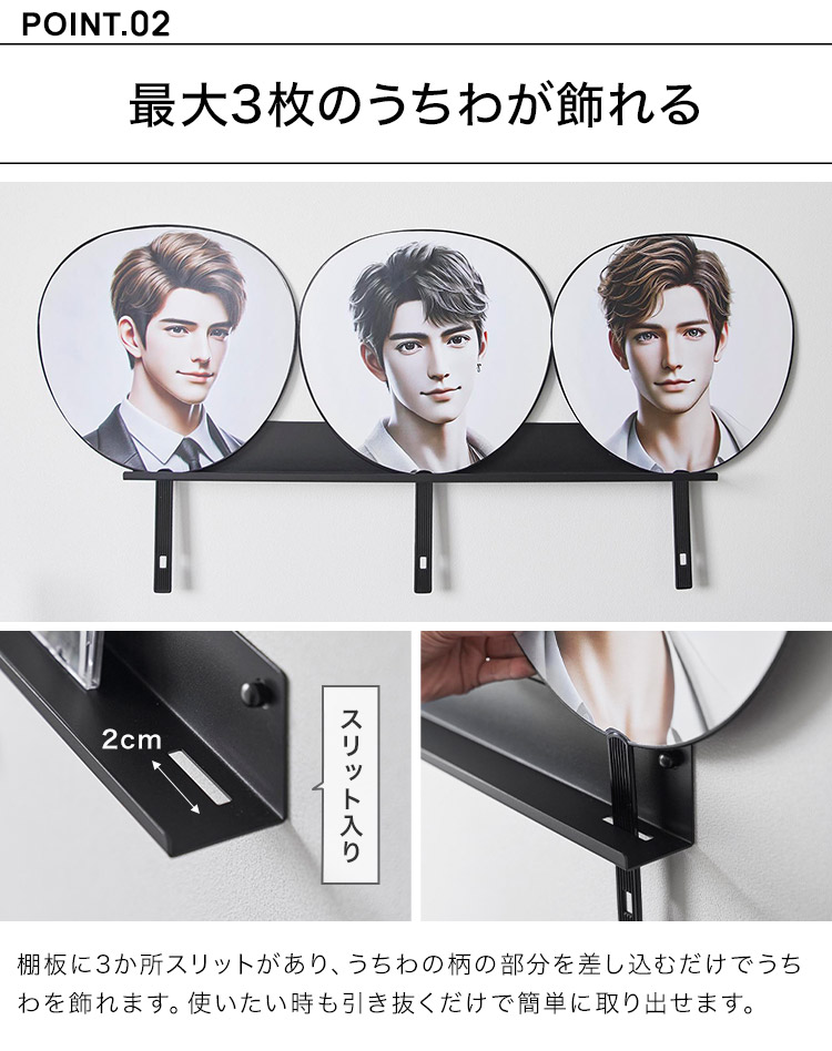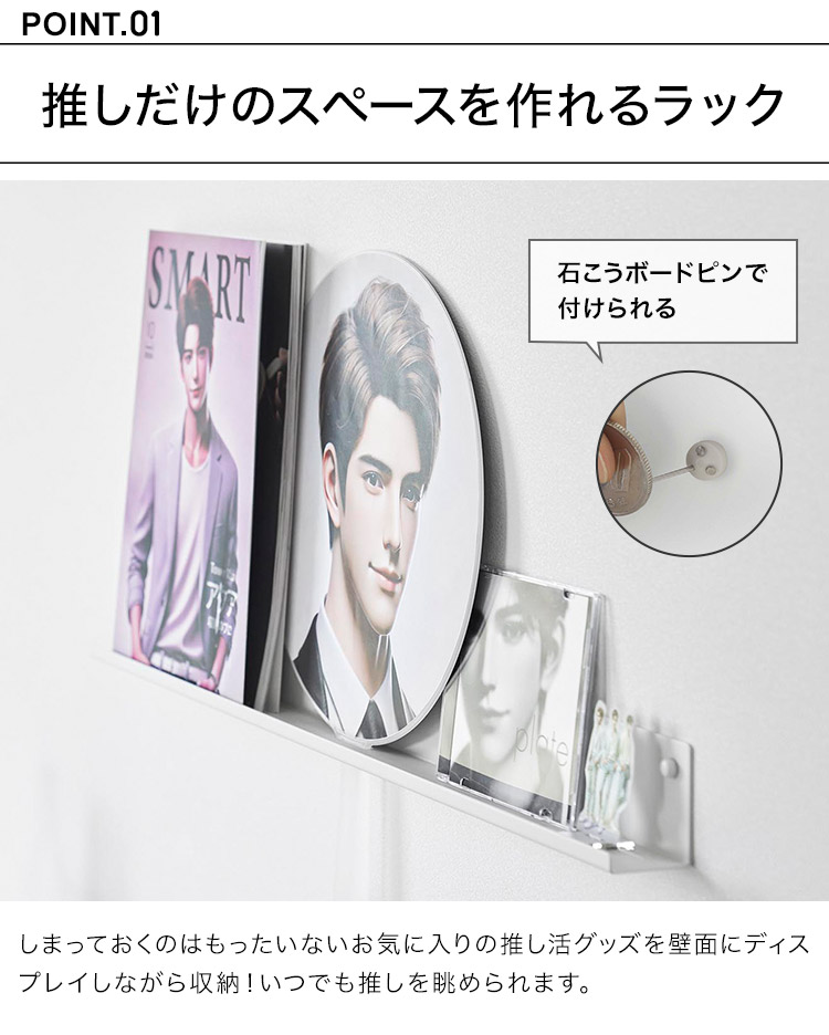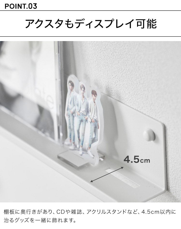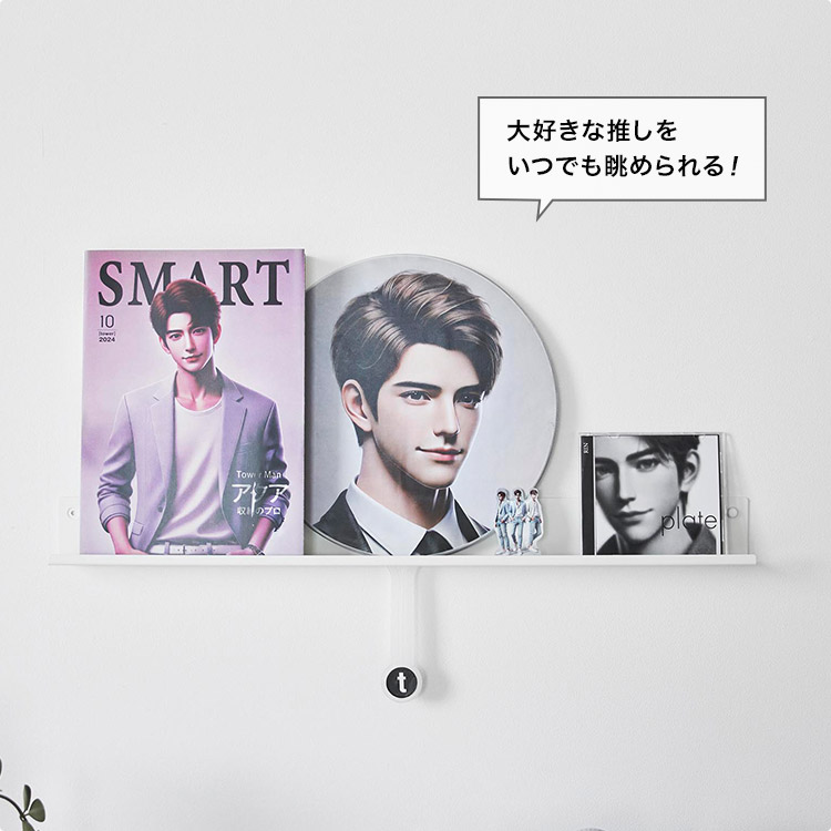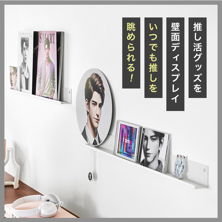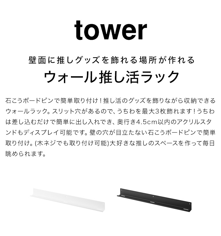 Details 【ウォール推し活ラック 石こうボード壁対応】 石こうボードピンで簡単取り付け!推し活のグッズを飾りながら収納できるウォールラック。スリット穴があるので、うちわを最大3枚飾れます!差し込むだけで簡単に出し入れできます。奥行き4.5cm以内のアクリルスタンドもディスプレイ可能です。壁の穴が目立たない石こうボードピンで簡単取り付け。(木ネジでも取り付け可能) ブランド名 tower / タワー 品番 1889/1890 サイズ 約H6.1×W67×D4.8cm 重量 約750g 素材 本体:スチール(粉体塗装) 付属品 石こうボードピンセット×3(取り付けピース×3、クギ×9、キャップ×3) 木ネジ×3 取り付け可能な壁 石こうボードピン使用時:壁紙・布壁紙・ビニール壁紙貼りなどの石こうボード・薄ベニヤ 木ネジ使用時:柱・板壁(厚さ1cm以上) プリント合板(裏側に水平にサンがある場所) 裏に下地材(間柱)が入っている壁 耐荷重 2kg(静止荷重) 生産国 中国 ご注意 ※表記サイズより、多少の誤差があることがございます。 ※商品の画像はできる限り実物に近づけるよう配慮しておりますが、お使いのモニターやご覧になる環境によりましてはカラーの見え方に差が出る場合がございます。ご了承くださいませ。 関連キーワード 山崎実業 ウォール推し活ラック タワー 石こうボード壁対応 3744 3745 tower 推し活 収納ラック 壁がけ うちわ オタク グッズ収納 飾り棚 収納棚 CD DVD カード アクスタ 壁面収納 ディスプレイ 飾れる スペース ラック アクリルスタンド 省スペース 石膏ボード ピン 木ネジ 推し活棚 推しかつ 浮かせる収納 見せる収納 ウォールポケット 壁掛け 部屋 装飾 有効活用 オタ活 ヲタ活 収納ホルダー シンプル ホワイト ブラック 白 黒 モノトーン スリット入り 差し込み穴 3本 賃貸 おしゃれ お洒落 ウォールラック 雑誌 展示 | |||||||||||||