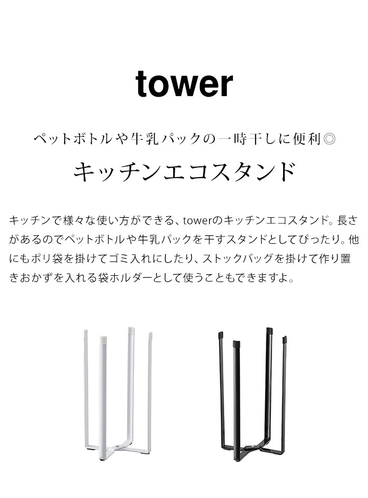 キッチンで様々な使い方ができる、towerのキッチンエコスタンド。長さがあるのでペットボトルや牛乳パックを干すスタンドとしてぴったり。他にもポリ袋を掛けてゴミ入れにしたり、ストックバッグを掛けて作り置きおかずを入れる袋ホルダーとして使うこともできますよ。