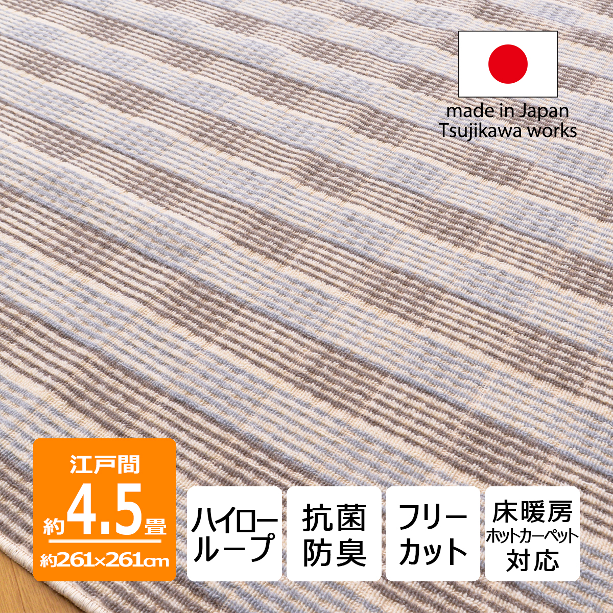カーペット 江戸間 4.5畳 サイズ 格子柄 抗菌防臭 フリーカット 床暖房 デイジー 261×261cm 四畳半 日本製 辻川産業株式会社