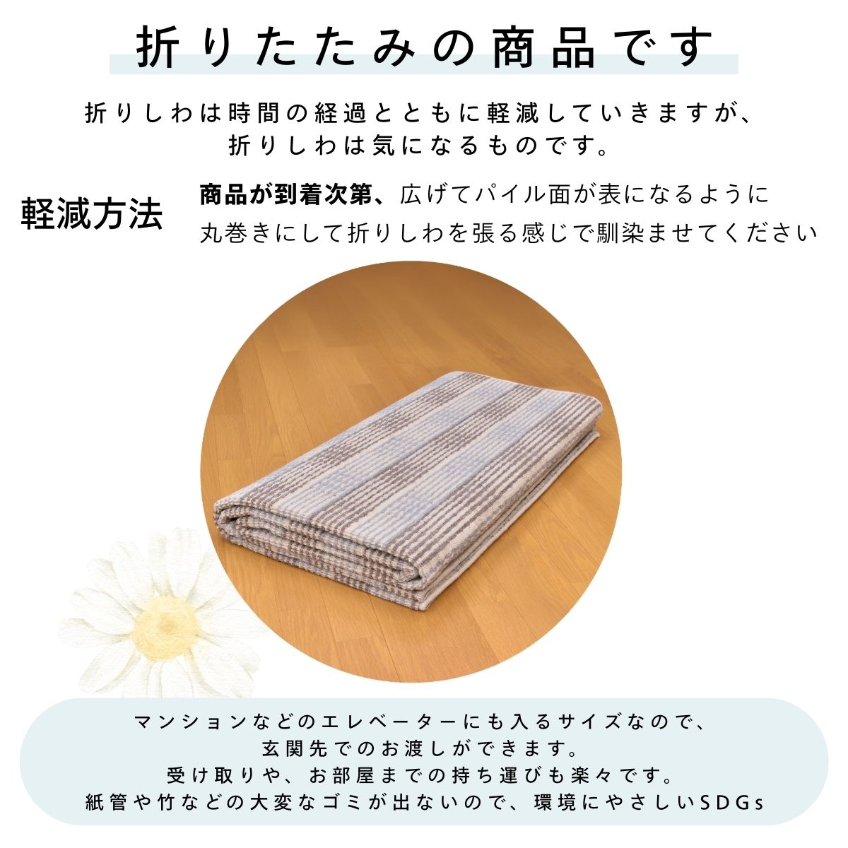 弊社従来品より折りじわを軽減した畳み方で発送いたします。