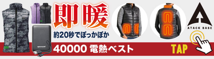 ATACK BASE 40050 ヒートインナーベスト バッテリーセット スイッチ付けて約20秒でぽっかぽか! 着合わせに響きにくい深いV首ラインを採用した、重ね着仕様のインナーヒートベスト。