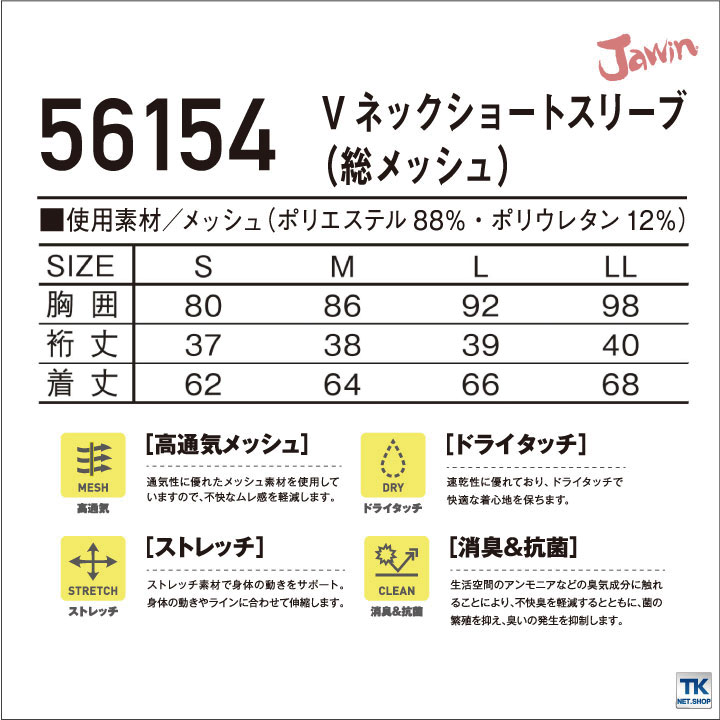 インナーシャツ Vネック半袖アンダーシャツ 春夏 Jawin 自重堂 インナーウェア 総メッシュ 半袖 ネコポス jd-56154