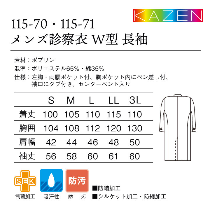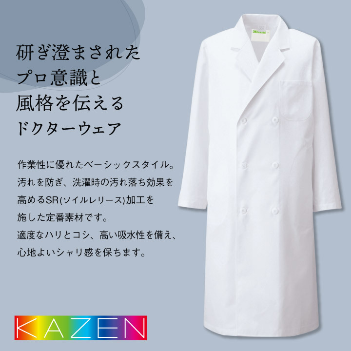 KAZEN 115-70 115-71 作業性に優れたベーシッックスタイル。 ドクターコート 長袖 診察衣 SEK制菌加工 吸汗性 防汚 シルケット加工 樹脂加工 防縮加工 ダブルタイプ Sから3L 男性用